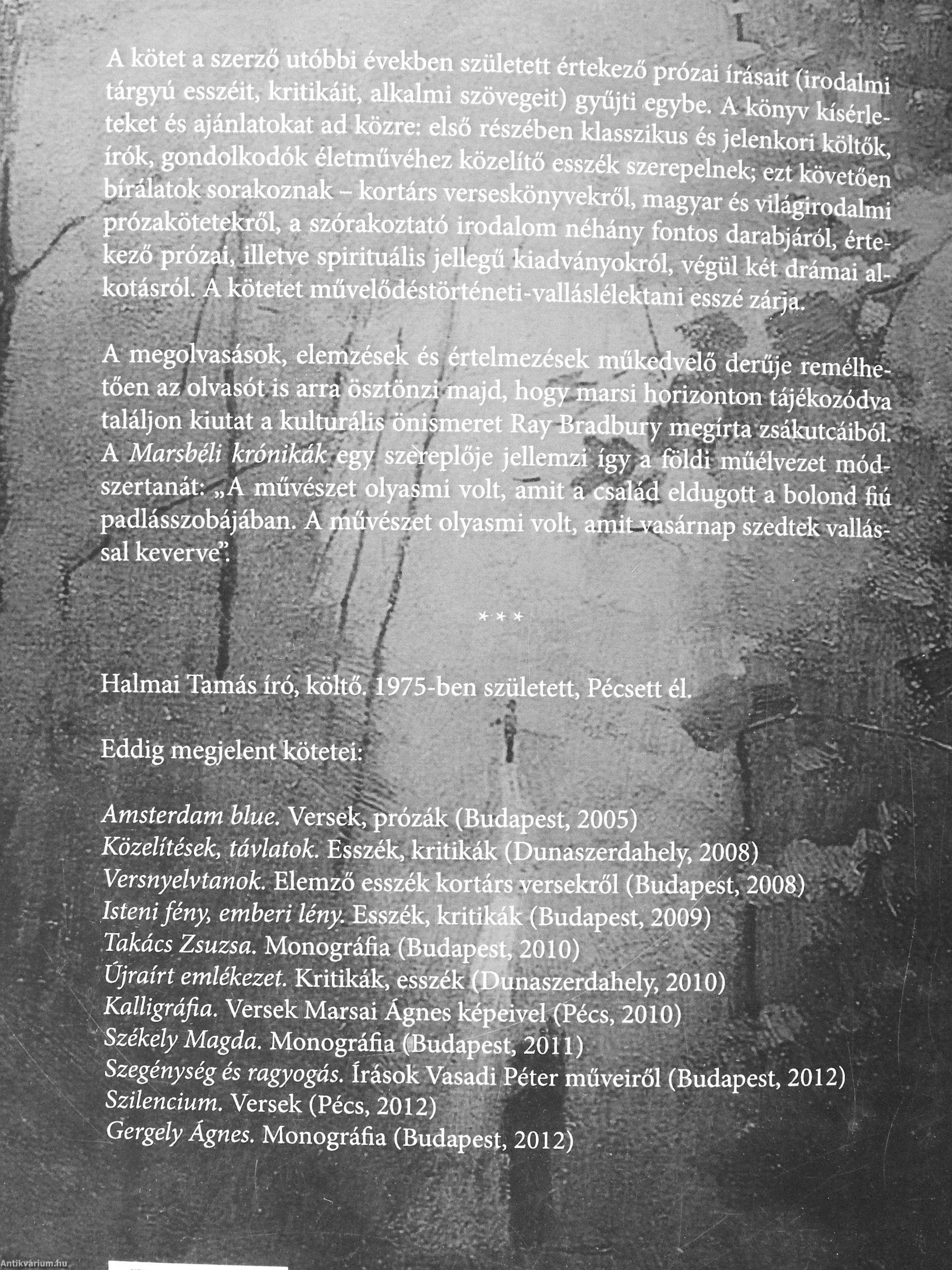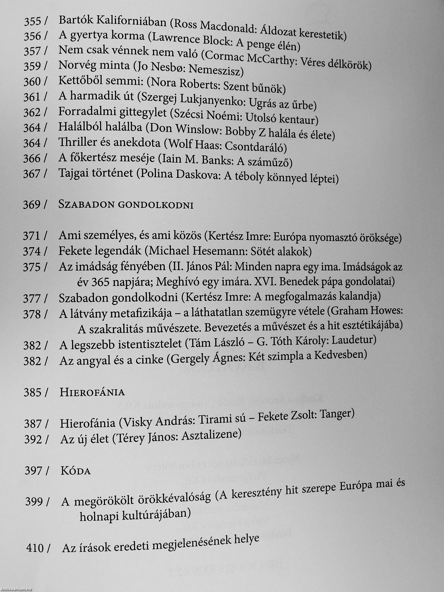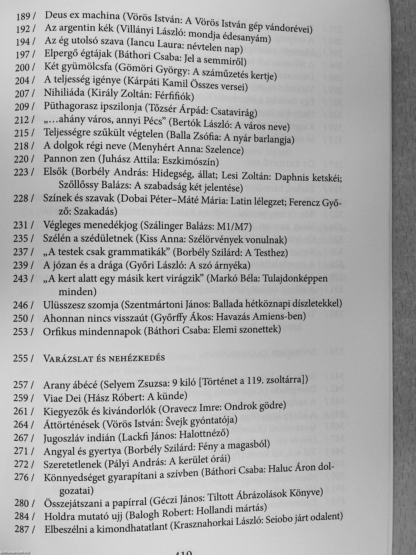' ' A kötet a szerző utóbbi évdien született értekező prózai írásait (irodEni . ; tárgyú esszélt, kritikmt, alkatew szövegeit) gyűjti egybe. A könyv kíséfle-teket és a|ániatokat ad közre: első rés^n klasszikus és jelenkori költők, .írók, gondolkodók^^űvéhez közelítő esszék szerepelnek; ezt követően'-" • ;" bírálatt^k^orakozhak - kortárs yeiaeskönyvekről, magyar és világirodalmi . ¦' : • prózakötetből, a szórakoztató irodatam néhány fontos darabjáról, érte- •