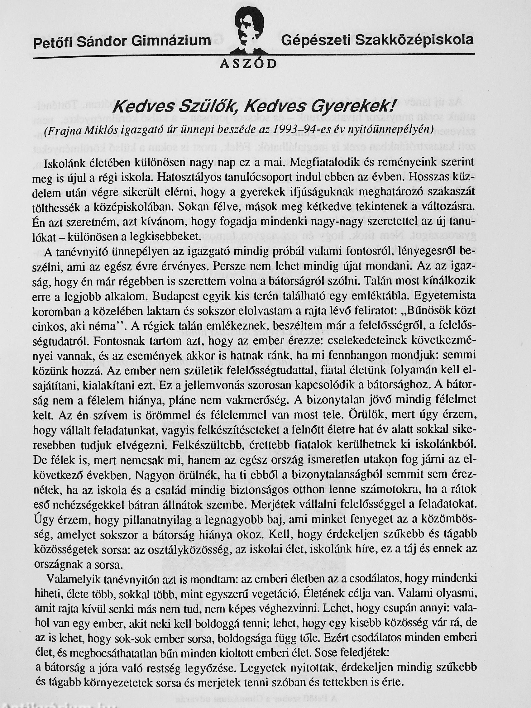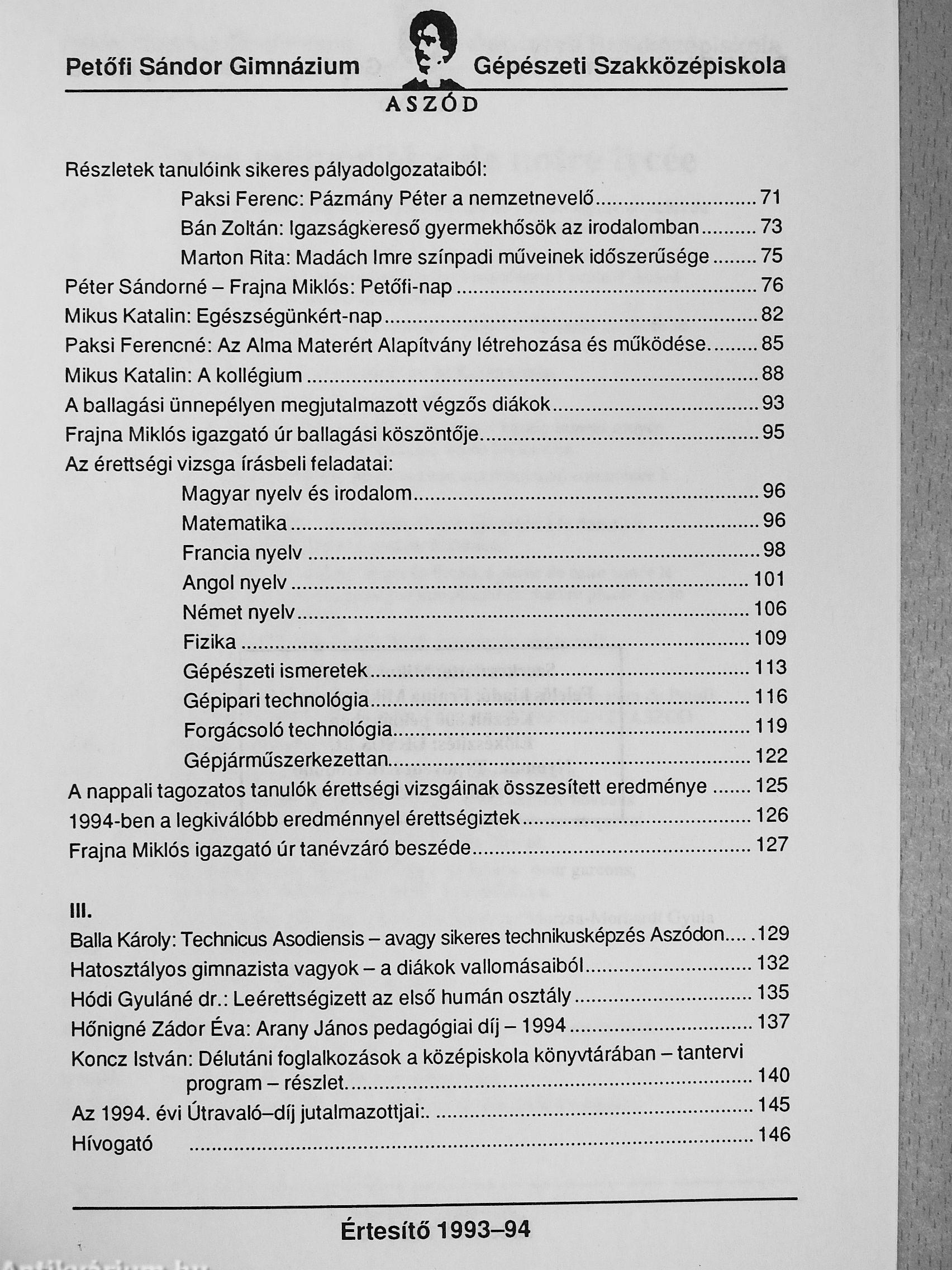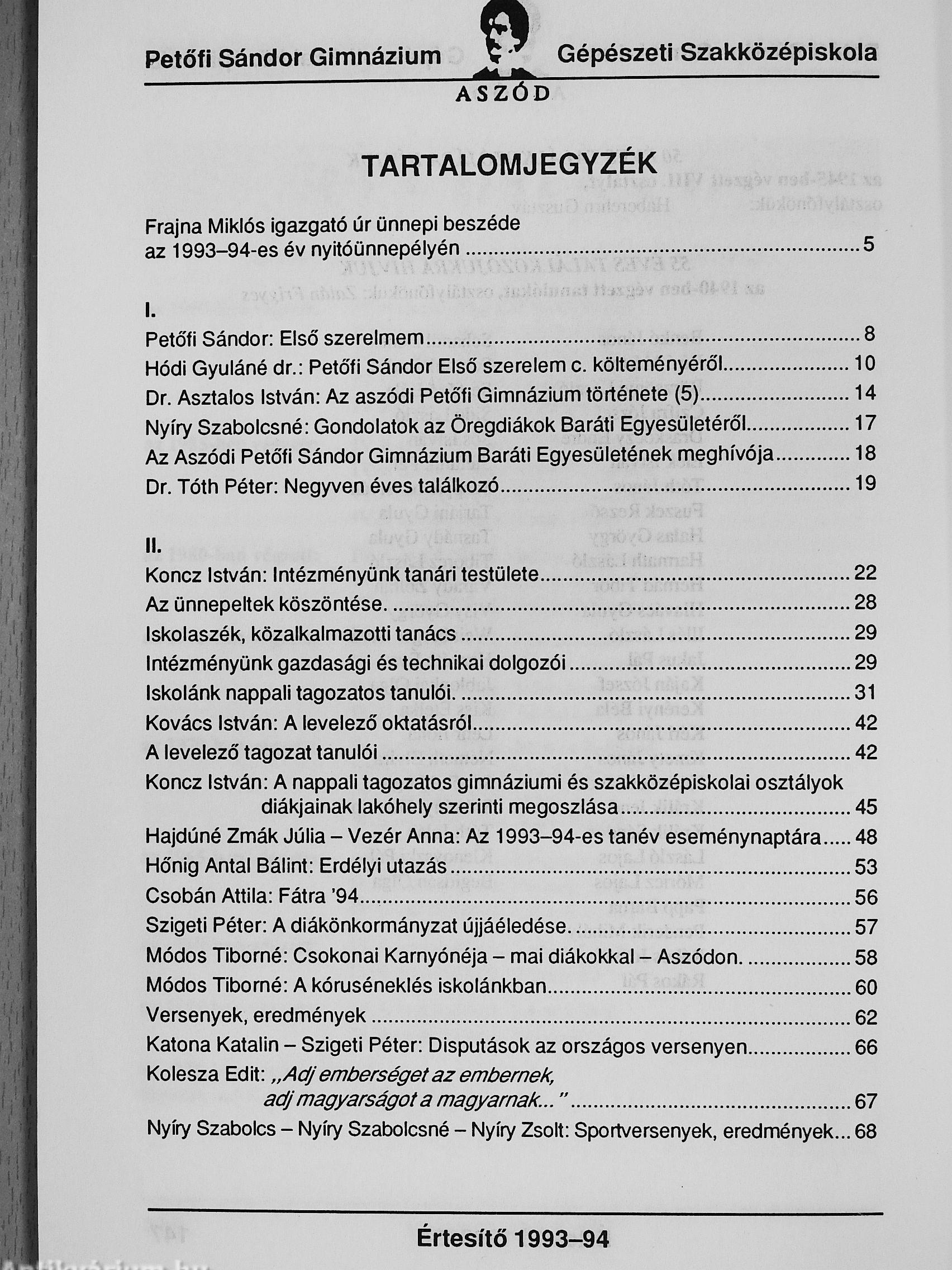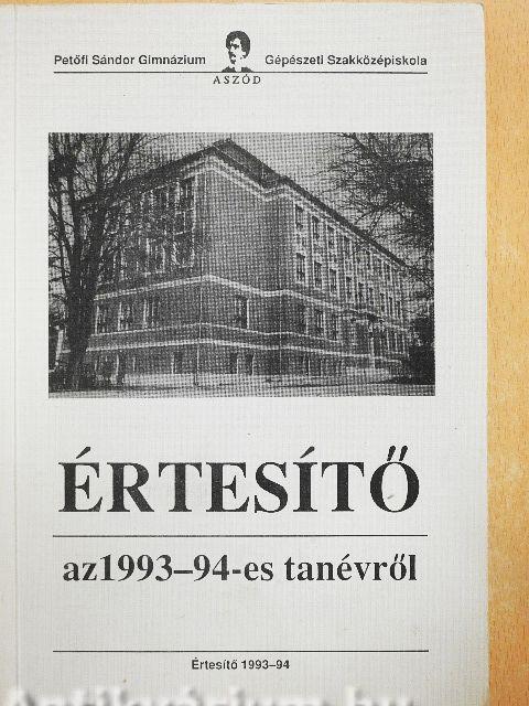 Az Aszódi Petőfi Sándor Gimnázium és Gépészeti Szakközépiskola Értesítője az 1993-94-ös tanévről
