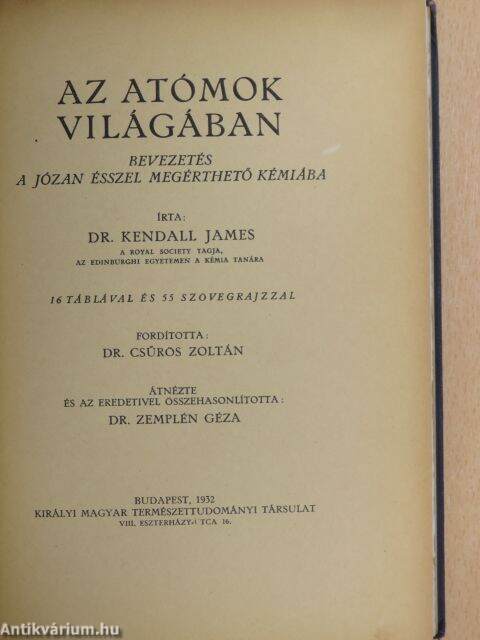 | Megjegyzés: | 16 táblával és 55 szövegrajzzal illusztrálva. Kir. Magy. Egyetemi Nyomda, Budapest nyomása. A XIX. (1929-1931. évi) ciklus harmadik kötete a könyvkiadóvállalat aláírói számára. Írta: Dr. Kendall James a Royal Society tagja, az Edinburghi Egyetemen a kémia tanára. |