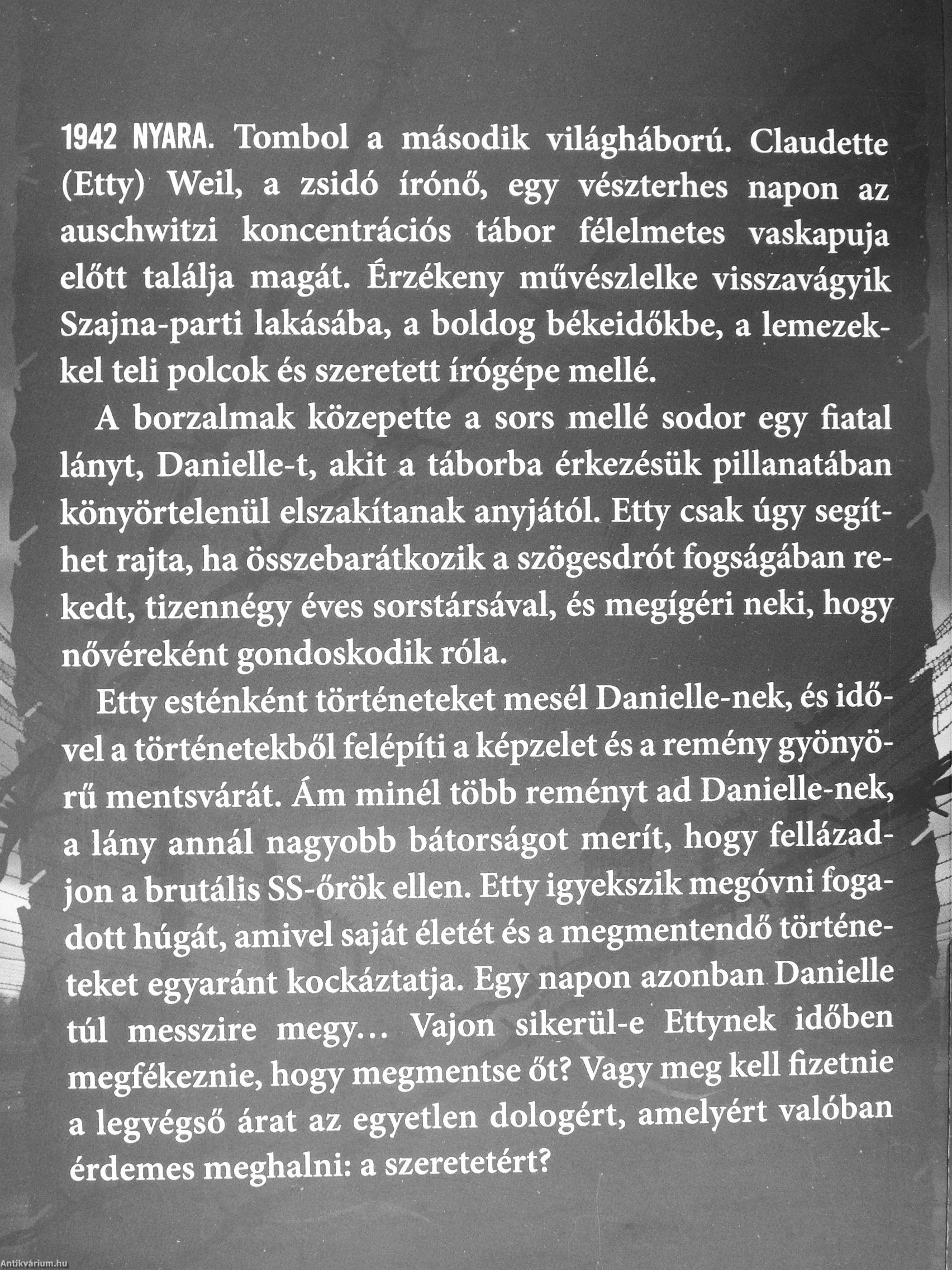 Etty esténként történeteket mesél Danielle-nek, és idő- | vei a történetekből felépíti a képzelet és a remény gyönyö-rű mentsvárát. Ám minél több reményt ad Danielle-nek, ^ a lány annál nagyobb bátorságot merít, hogy fellázad-jon a brutális SS-őrök ellen. Etty igyekszik megóvni foga- { dott húgát, amivel saját életét és a megmentendő történe- | teket egyaránt kockáztatja. Egy napon azonban Danielle || túl messzire megy Vajon sikerül-e Ettynek időben megfékeznie, hogy megmentse őt? Vagy meg kell fizetnie , a legvégső árat az egyetlen dologért, amelyért valóban érdemes meghalni: a szeretetért?