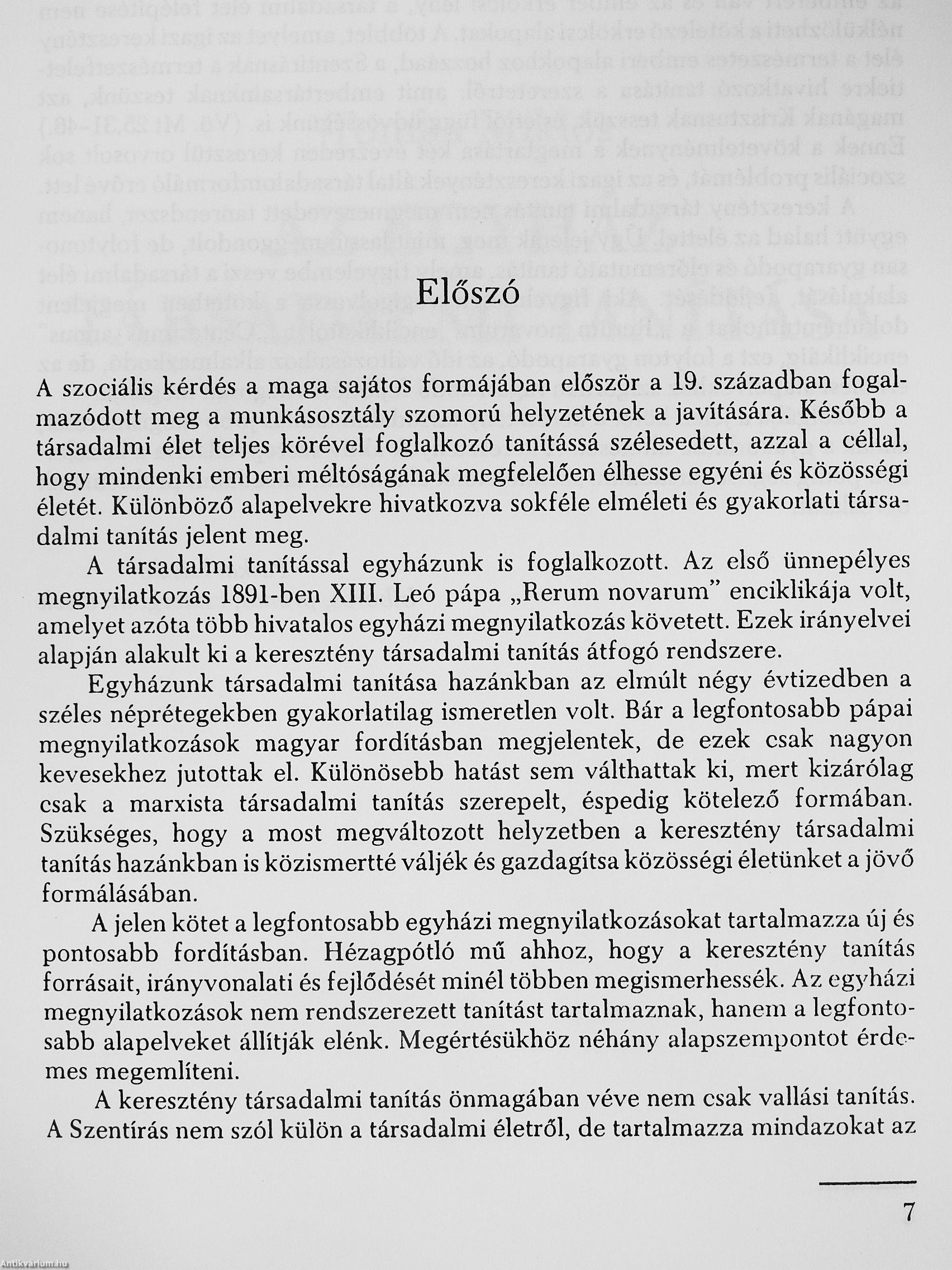 Hazánkban az elmúlt évtizedben Egyházunk társadalmi tanítása a széles néprétegekben gyakorlatilag ismeretlen volt. Bár a legfontosabb pápai megnyilatkozások -magyar fordításban megjelentek, de ezek csak nagyon kevesekhez jutottak el. Különösebb hatást sem válthattak ki, mert kizárólag csak a marxista társadalmi tanítás szerepelt, éspedig kötelező formában. Szükséges, hogy a most rriegváltozott helyzetben a keresztéay társadalmi tanítás hazánkban is közismertté váljék és gazdagítsa közösségi életünket a-jövö formálásában. A jelen kötet a legfontosabb egyházi megnyilvánulásokat tartalmazza új és pontosabb fordításban. Hézagpótló mü ahhoz, hogy a keresztény társadalmi tanítás forrásait, irányvonalait és fejlődését minél többen megismerhessék.