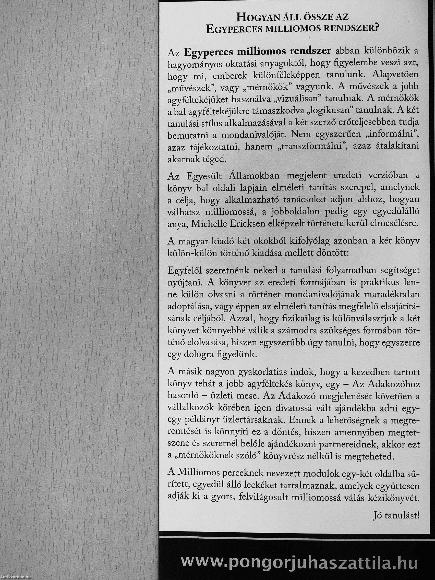 „Ne olvasd el, nem neked való! Ne olvasd el, nem neked való! Ne olvasd el, nem neked való! - ha ennek ellenére mégis elolvasod, akkor az egyik kitartás teszten már túl is jutottál Csak a jobb agyféltekés történetet olvastam, de már alig várom, hogy kézbe kapjam a másik felét. Rengeteg apró milliomos szokást, tulajdonságot, attitűdöt mutat be a könyv a való életben alkalmazva, a lebontandó paradigmákról nem is beszélve. Minden mondatát rágd meg, gondolkodj el rajta - legalább egy percre -, még ha szappanoperának tűnik is első olvasásra. Egynél többször el ne olvasd, mondom, egynél többször el ne olvasd, "