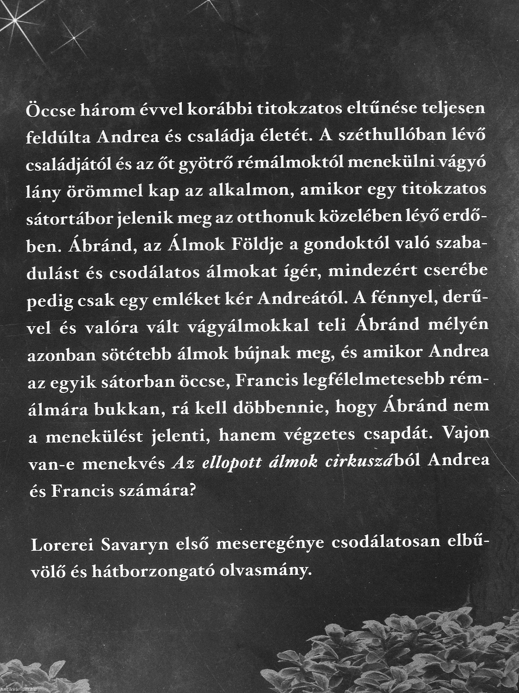 vei és valóra vált vágyálmokkal teli Ábránd mélyén azonban sötétebb álmok bújnak meg, és amikor Andrea az egyik sátorban öccse, Francis legfélelmetesebb rémálmára bukkan, rá kell döbbennie, hogy Ábránd nem a menekülést jelenti, hanem végzetes csapdát. Vajon van-e menekvés Az ellopott álmok cirkuszáhóX Andrea és Francis számára?