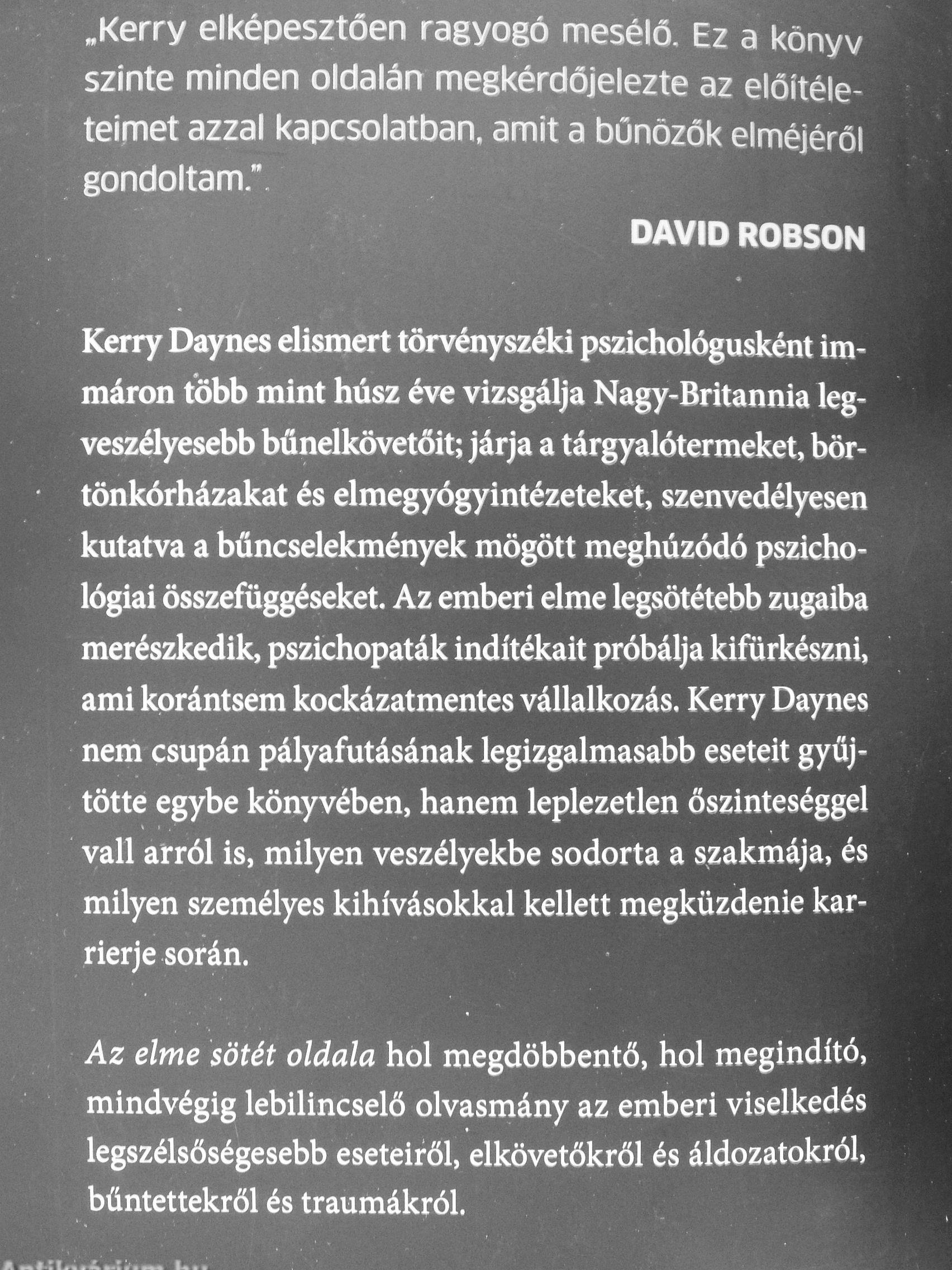 Kerry Daynes elismert törvényszéki pszichológusként iramáron több mint húsz éve vizsgálja Nagy-Britannia legveszélyesebb bűnelkövetőit; járja a tárgyalótermeket, börtönkórházakat és elmegyógyintézeteket, szenvedélyesen kutatva a bűncselekmények mögött meghúzódó pszichológiai összefüggéseket. Az emberi elme legsötétebb zugaiba merészkedik, pszichopaták indítékait próbálja kifürkészni, ami korántsem kockázatmentes vállalkozás. Kerry Daynes nem csupán pályafutásának legizgalmasabb eseteit gyűjtötte egybe könyvében, hanem leplezetlen őszinteséggel vall arról is, milyen veszélyekbe sodorta a szakmája, és milyen személyes kihívásokkal kellett megküzdenie kar-