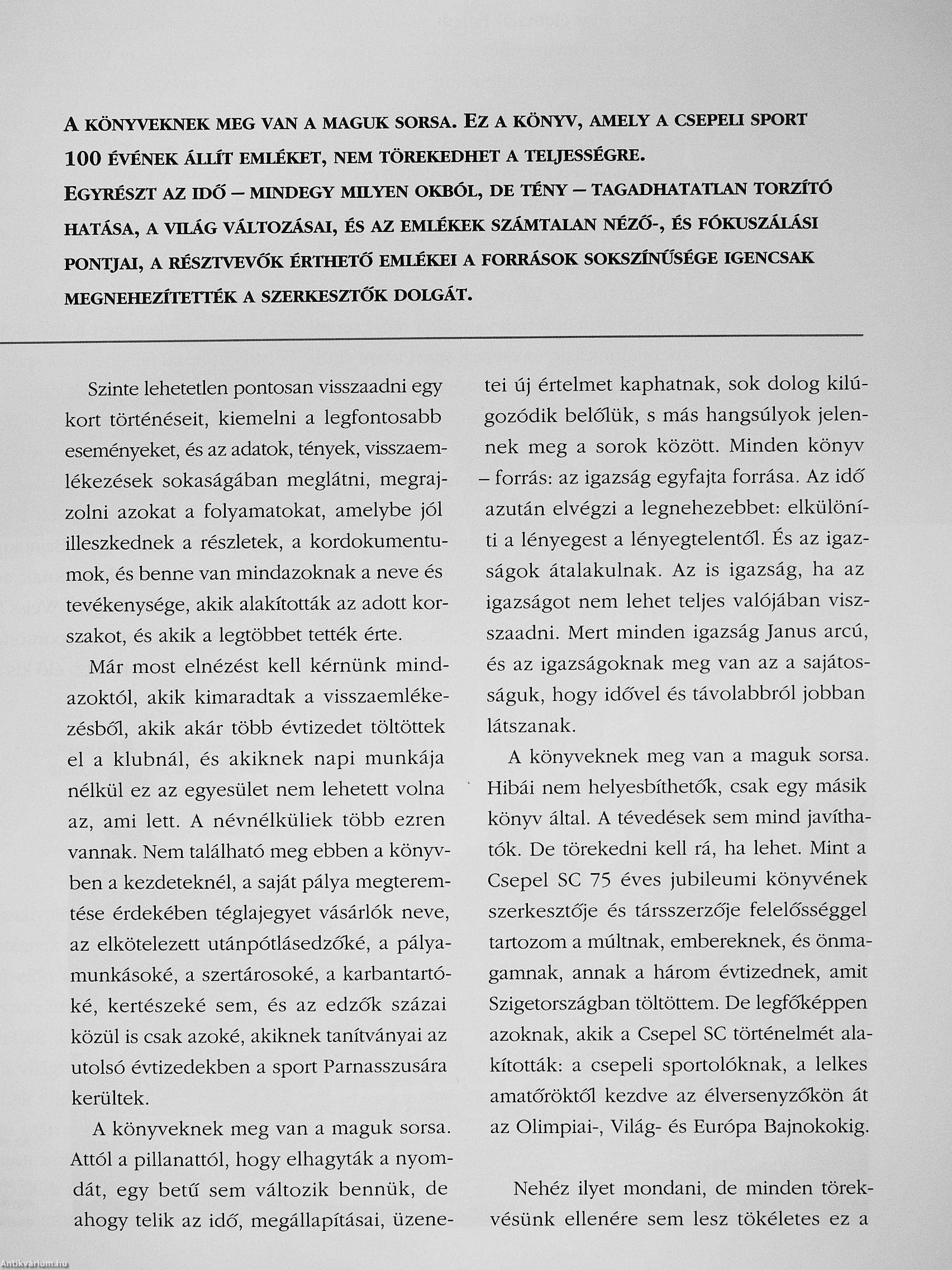 A könyveknek meg van a maguk sorsa. Ez a könyv, amely a csepeli sport 100 évének állít emléket, nem törekedhet a teljességre. Egyrészt az idő mindegy milyen okból, de tény tagadhatatlan torzító hatása, a világ változásai, és az emlékek számtalan néző-, és fókuszálási pontjai, a résztvevők érthető emlékei a források sokszínűsége igencsak megnehezítették a szerkesztők dolgát.