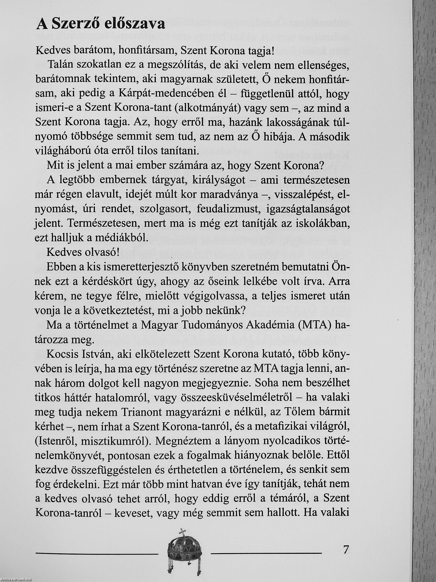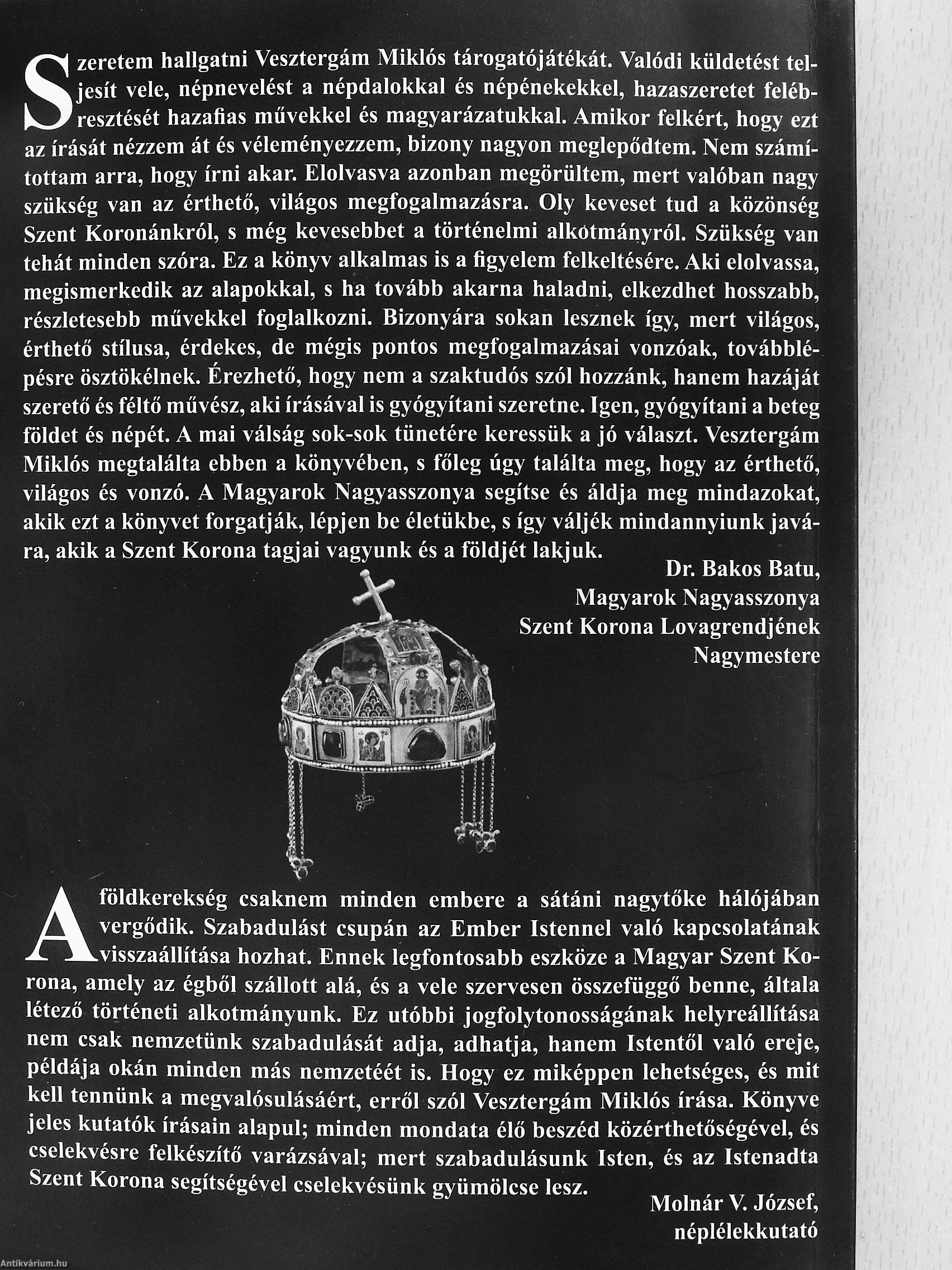 Szeretem hallgatni Vesztergám Miklós tárogatójátékát. Valódi küldetést teljesít vele, népnevelést a népdalokkal és népénekekkel, hazaszeretet felébresztését hazafias művekkel és magyarázatukkal. Amikor felkért, hogy ezt az írását nézzem át és véleményezzem, bizony nagyon meglepődtem. Nem számítottam arra, hogy írni akar. Elolvasva azonban megörültem, mert valóban nagy szükség van az érthető, világos megfogalmazásra. Oly keveset tud a közönség Szent Koronánkról, s még kevesebbet a történelmi alkötmányról. Szükség van tehát minden szóra. Ez a könyv alkalmas is a figyelem felkeltésére. Aki elolvassa, megismerkedik az alapokkal, s ha tovább akarna haladni, elkezdhet hosszabb, részletesebb művekkel foglalkozni. Bizonyára sokan lesznek így, mert világos, érthető stílusa, érdekes, de mégis pontos megfogalmazásai vonzóak, továbblépésre ösztökélnek. Érezhető, hogy nem a szaktudós szól hozzánk, hanem hazáját szerető és féltő művész, aki írásával is gyógyítani szeretne. Igen, gyógyítani a beteg földet és népét. A mai válság sok-sok tünetére keressük a jó választ. Vesztergám Miklós megtalálta ebben a könyvében, s főleg úgy találta meg, hogy az érthető, világos és vonzó. A Magyarok Nagyasszonya segítse és áldja meg mindazokat, akik ezt a könyvet forgatják, lépjen be életükbe, s így váljék mindannyiunk javára, akik a Szent Korona tagjai vagyunk és a földjét lakjuk.