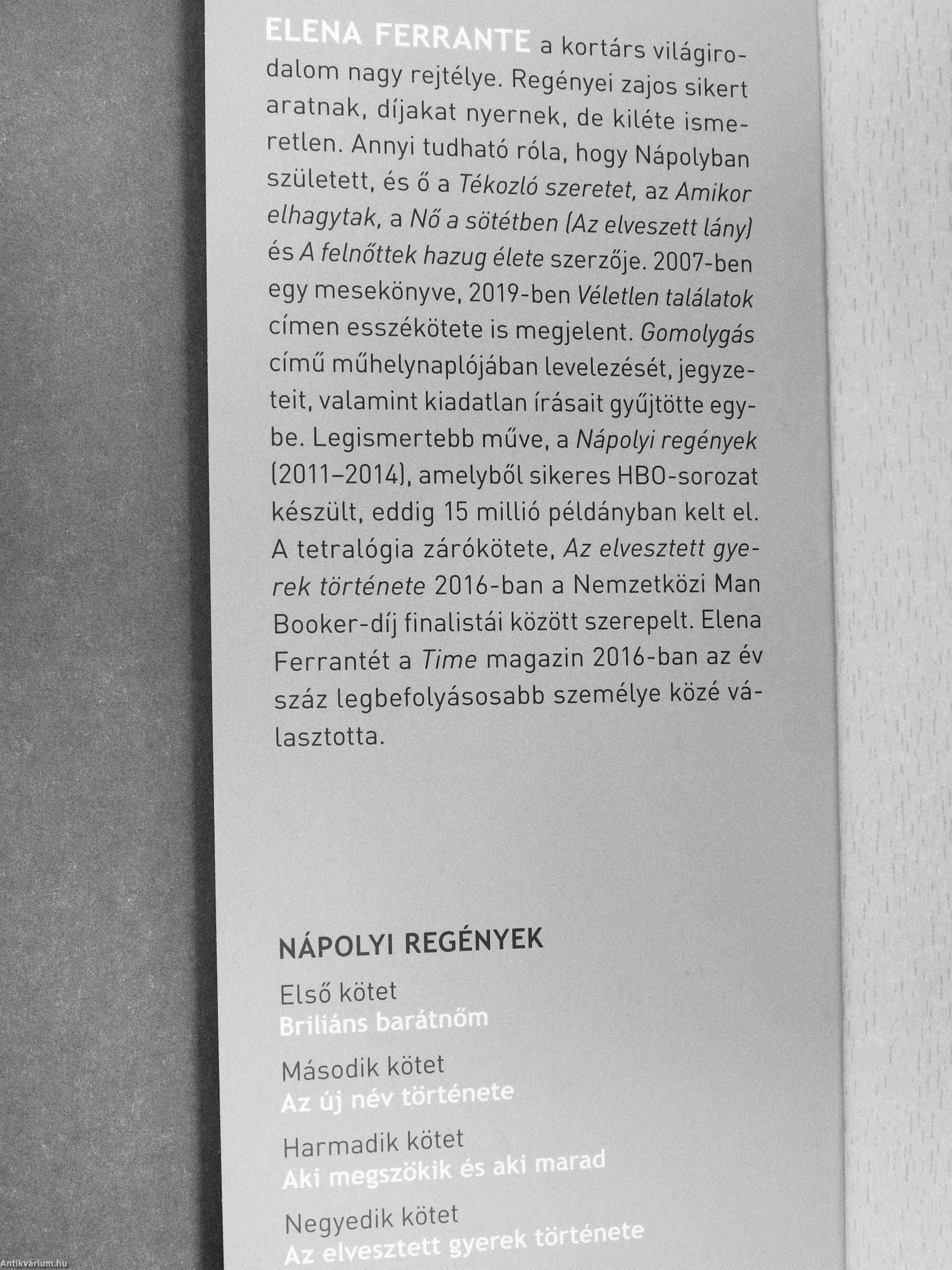 dalom nagy rejtélye. Regényei zajos sikert aratnak, díjakat nyernek, de kiléte ismeretlen. Annyi tudható róla, hogy Nápolyban született, és ö a Tékozló szeretet, az Amikor elhagytak, a Nő a sötétben (Az elveszett lányi és A felnőttek hazug élete szerzője. 2007-ben egy mesekönyve, 2019-ben Véletlen találatok címen esszékötete is megjelent. Gomolygás című műhelynaplójában levelezését, jegyzeteit, valamint kiadatlan írásait gyűjtötte egybe. Legismertebb műve, a Nápolyi regények (2Ü11-2ÜU). amelyből sikeres HBO-sorozat készült, eddig 15 millió példányban kelt el. A tetralógia zárókötete, Az elvesztett gyerek története 2016-ban a Nemzetközi Man Booker-díj finalistái között szerepelt. Elena Ferrantét a Tinne magazin 2016-ban az év száz legbefolyásosabb személye közé...