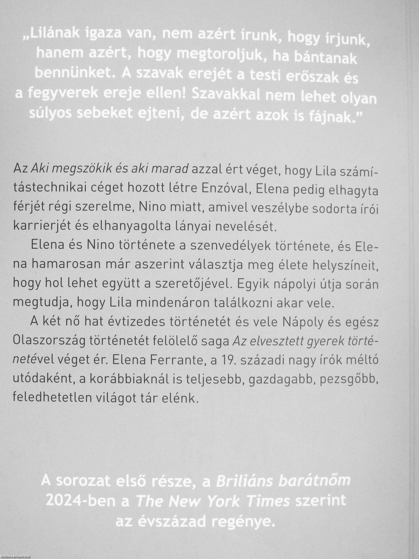A két nő hat évtizedes történetét és vele Nápoly és egész Olaszország történetét felölelő saga Az elvesztett gyerek történetével véget ér. Elena Ferrante, a 19. századi nagy írók méltó utódaként, a korábbiaknál is teljesebb, gazdagabb, pezsgőbb, feledhetetlen világot tár elénk.
