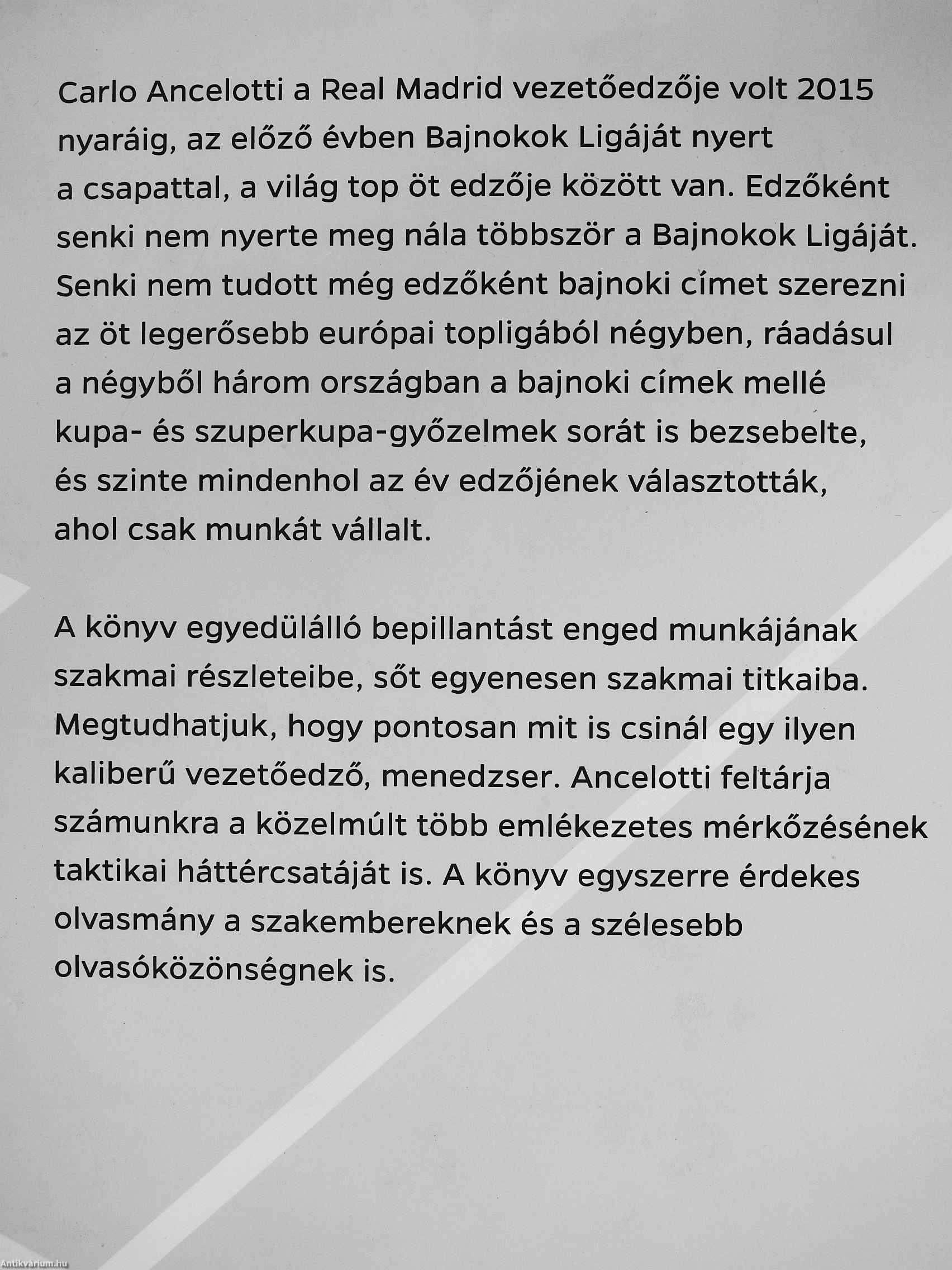 A könyv egyedülálló bepillantást enged munkájának szakmai részleteibe, sőt egyenesen szakmai titkaiba. Megtudhatjuk, hogy pontosan mit is csinál egy ilyen kaliberű vezetőedző, menedzser. Ancelotti feltárja számunkra a közelmúlt több emlékezetes mérkőzésének taktikai háttércsatáját is. A könyv egyszerre érdekes olvasmány a szakembereknek és a szélesebb olvasóközönségnek is.
