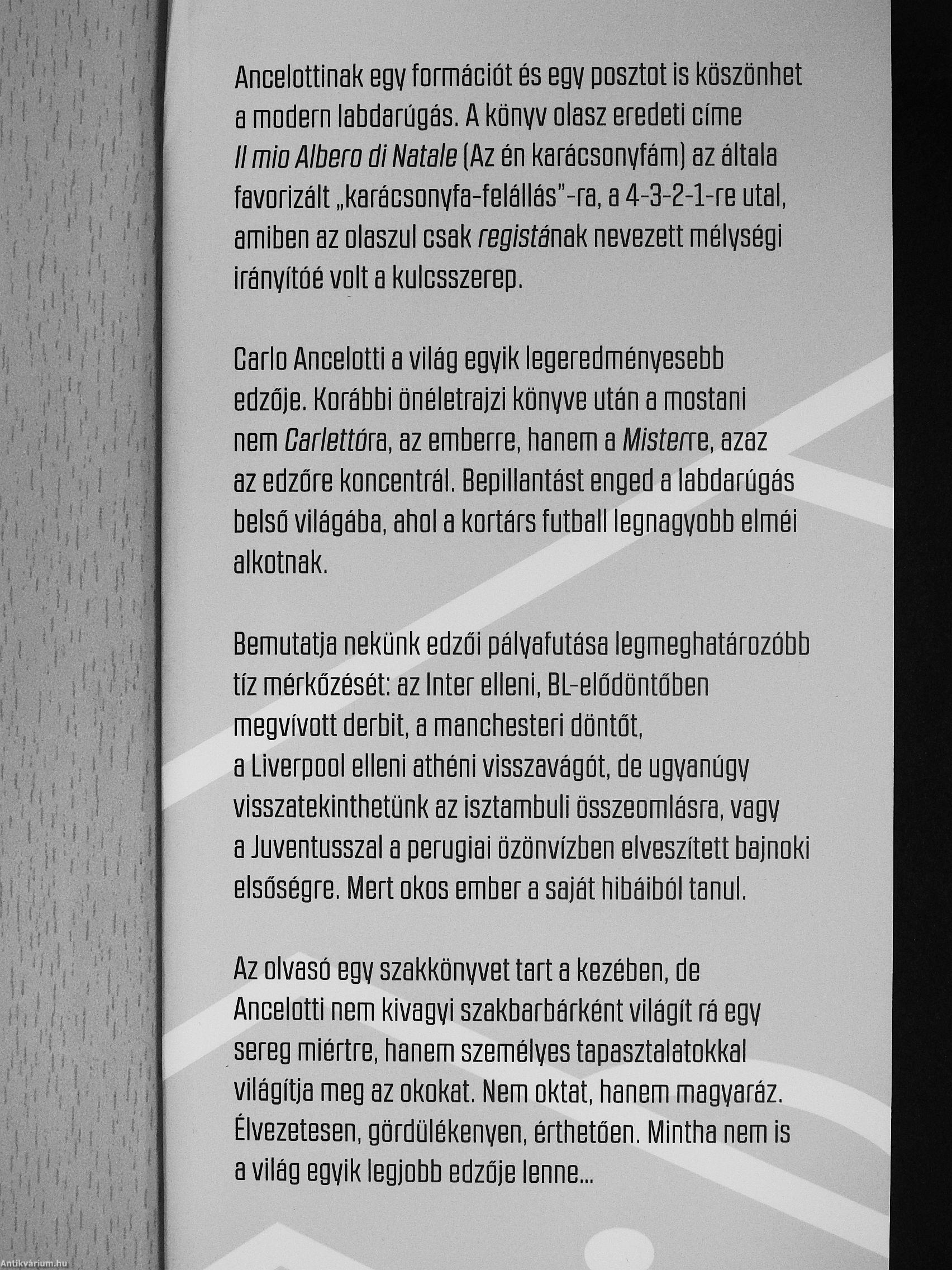 Ancelottinak egv formációt es egv posztot is köszönhet a modem labdarúgás. A könvv olasz eredeti címe llmioAlbem diMale (Az én karácsonvfám) az általa favorizált „karácsonvfa-feiáliás"-ra, a 4-3-2-1-re utal, amiben az olaszul csak reg/síának nevezett mélvsegi iránvítóé volt a kulcsszerep,