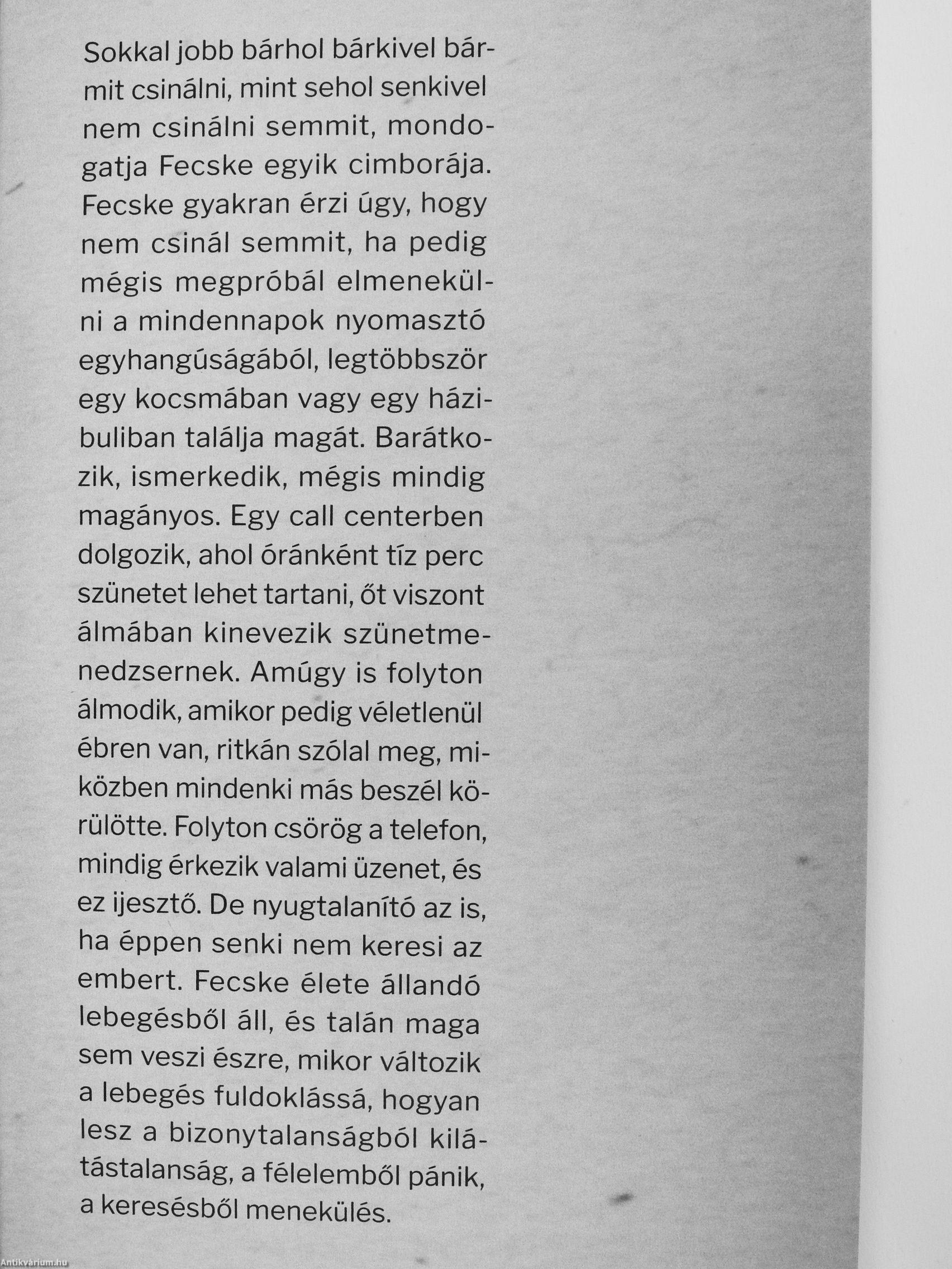 Sokkal jobb bárhol bárkivel bármit csinálni, mint sehol senkivel nem csinálni semmit, mondogatja Fecske egyik cimborája. Fecske gyakran érzi ügy, hogy nem csinál semmit, ha pedig mégis megpróbál elmenekülni a mindennapok nyomasztó egyhangúságából, legtöbbször egy kocsmában vagy egy házibuliban találja magát. Barátkozik, ismerkedik, mégis mindig magányos. Egy call centerben dolgozik, ahol óránként tíz perc szünetet lehet tartani, őt viszont álmában kinevezik szünetmenedzsernek. Amügy is folyton álmodik, amikor pedig véletlenül ébren van, ritkán szólal meg, miközben mindenki más beszél körülötte. Folyton csörög a telefon, mindig érkezik valami üzenet, és ez ijesztő. De nyugtalanító az is, ha éppen senki nem keresi az embert. Fecske élete állandó lebegésből áll, és talán maga sem veszi észre, mikor változik a lebegés fuldoklássá, hogyan lesz a bizonytalanságból kilátástalanság, a félelemből pánik, a keresésből menekülés.