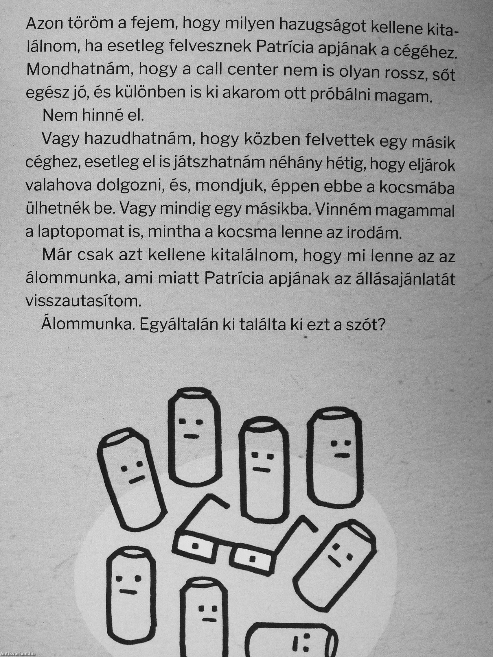 Azon töröm a fejem, hogy milyen hazugságot kellene kitalálnom, ha esetleg felvesznek Patrícia apjának a cégéhez. Mondhatnám, hogy a call center nem is olyan rossz, sőt egész jó, és különben is ki akarom ott próbálni magam.
