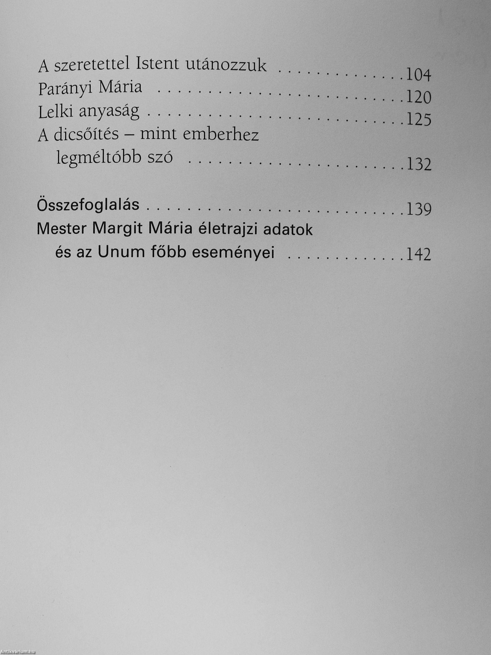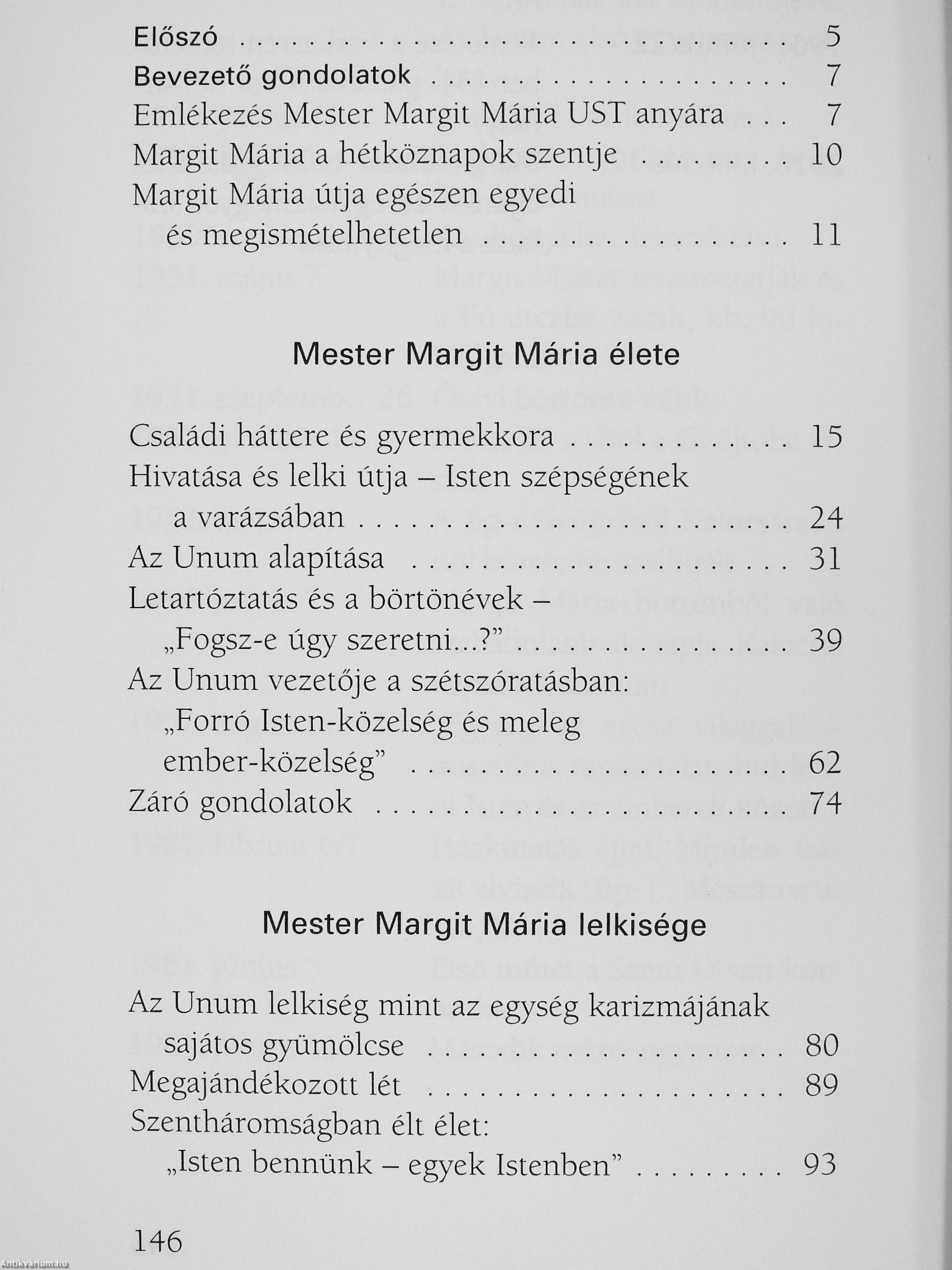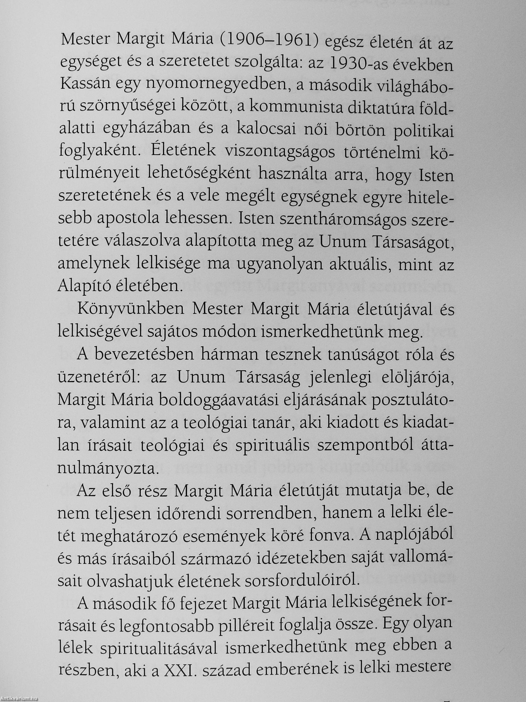 Mester Margit Mária (1906-1961) egész életén át az egységet és a szeretetet szolgálta: az 1930-as években Kassán egy nyomornegyedben, a második világháború szörnyűségei között, a kommunista diktatúra földalatti egyházában és a kalocsai női börtön politikai foglyaként. Életének viszontagságos történelmi körülményeit lehetőségként használta arra, hogy Isten szeretetének és a Vele megélt egységnek egyre hitelesebb apostola lehessen. Isten szentháromságos szeretetére válaszolva alapította meg az Unum Társaságot, amelynek lelkisége ma ugyanolyan aktuális, mint az Alapító életében.