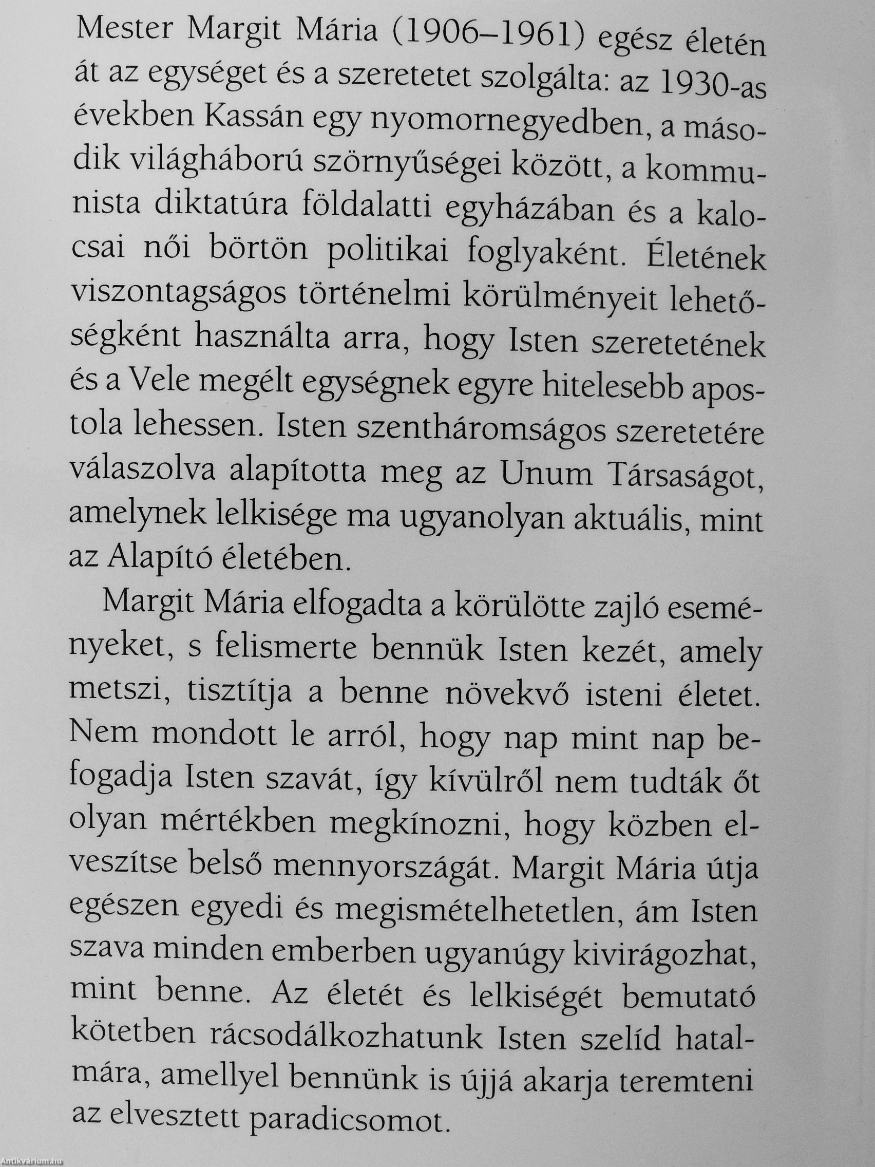 Margit Mária elfogadta a körülötte zajló eseményeket, s felismerte bennük Isten kezét, amely metszi, tisztítja a benne növekvő isteni életet. Nem mondott le arról, hogy nap mint nap befogadja Isten szavát, így kívülről nem tudták őt olyan mértékben megkínozni, hogy közben elveszítse belső mennyországát. Margit Mária útja egészen egyedi és megismételhetetlen, ám Isten szava minden emberben ugyanúgy kivirágozhat, mint benne. Az életét és lelkiségét bemutató kötetben rácsodálkozhatunk Isten szelíd hatalmára, amellyel bennünk is újjá akarja teremteni az elvesztett paradicsomot.