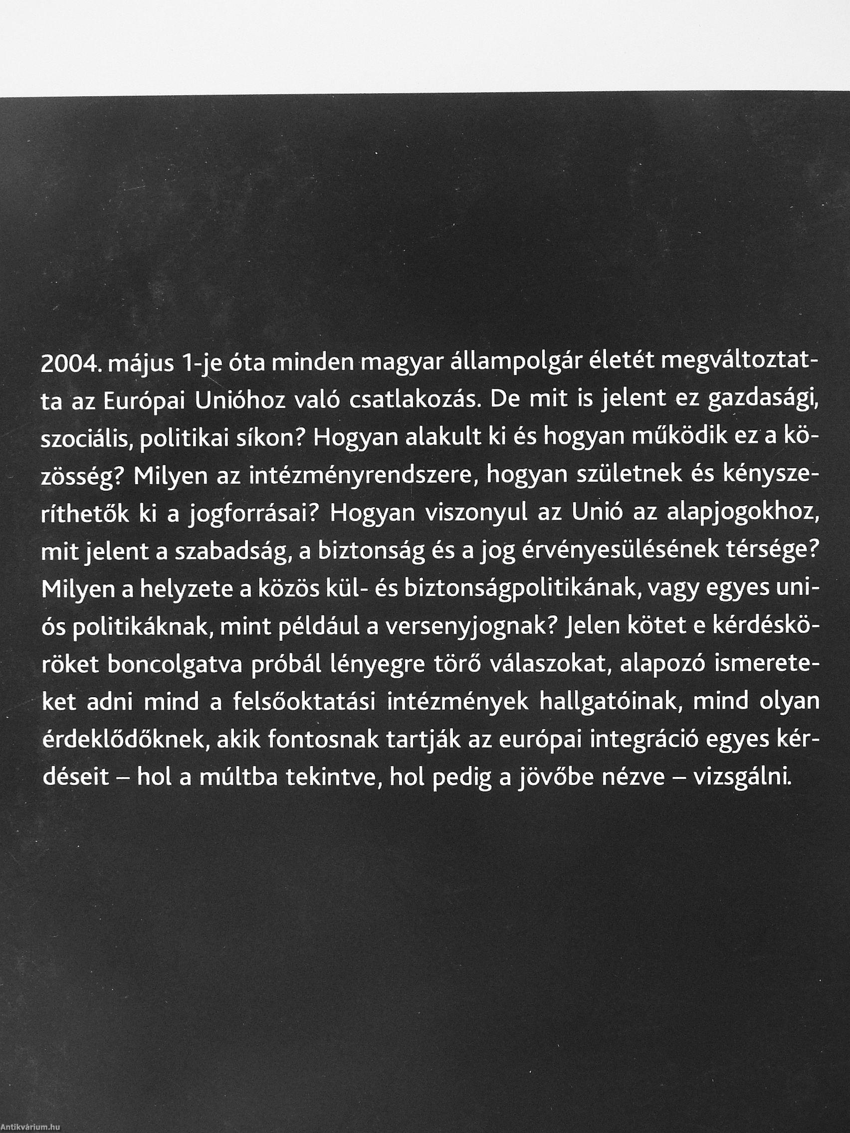 2004. május 1-je óta minden magyar állampolgár életét megváltoztatta az Európai Unióhoz való csatlakozás. De mit is jelent ez gazdasági, szociális, politikai síkon? Hogyan alakult ki és hogyan működik ez a közösség? Milyen az intézményrendszere, hogyan születnek és kényszeríthetők ki a jogforrásai? Hogyan viszonyul az Unió az alapjogokhoz, mit jelent a szabadság, a biztonság és a jog érvényesülésének térsége? Milyen a helyzete a közös kül- és biztonságpolitikának, vagy egyes uniós politikáknak, mint például a versenyjognak? Jelen kötet e kérdésköröket boncolgatva próbál lényegre törő válaszokat, alapozó ismereteket adni mind a felsőoktatási intézmények hallgatóinak, mind olyan érdeklődőknek, akik fontosnak tartják az európai integráció egyes kérdéseit - hol a múltba tekintve, hol pedig a jövőbe nézve - vizsgálni.