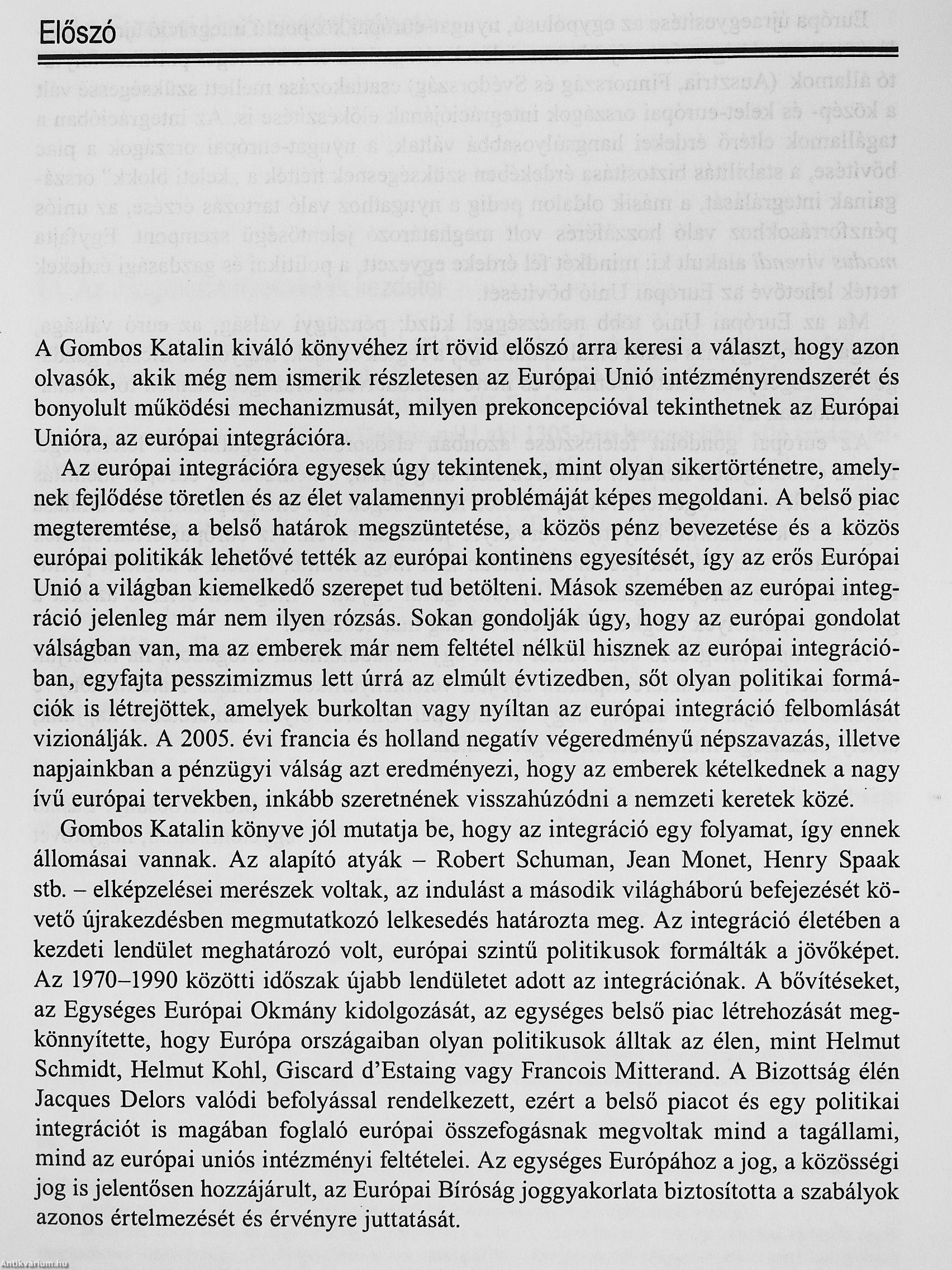 A Gombos Katalin kiváló könyvéhez írt rövid előszó arra keresi a választ, hogy azon olvasók, akik még nem ismerik részletesen az Európai Unió intézményrendszerét és bonyolult működési mechanizmusát, milyen prekoncepcióval tekinthetnek az Európai Unióra, az európai integrációra.
