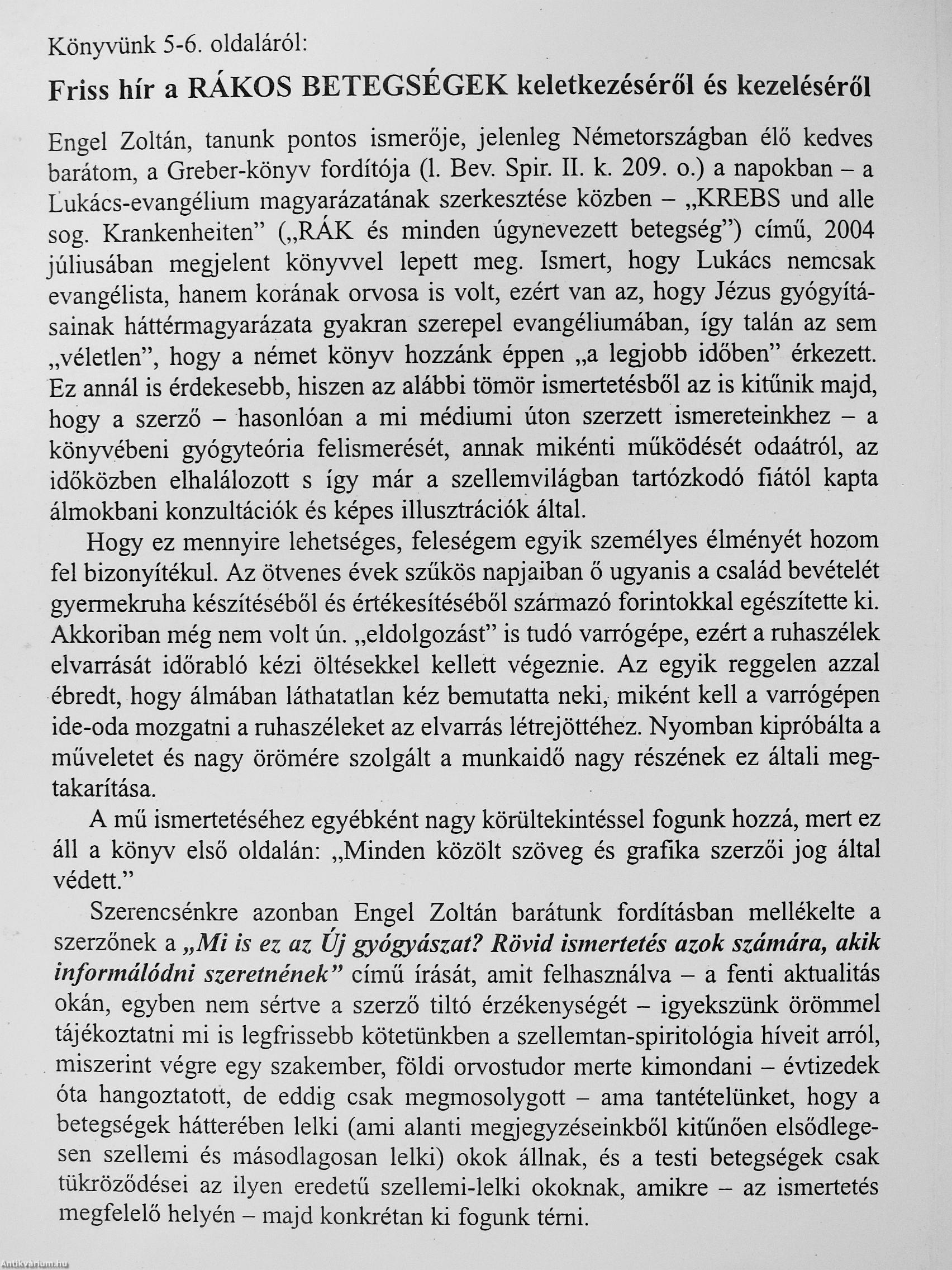 Engel Zoltán, tanunk pontos ismerője, jelenleg Németországban élő kedves barátom, a Greber-könyv fordítója (1. Bev. Spir. II. k. 209. o.) a napokban - a Lukács-evangélium magyarázatának szerkesztése közben - „KREBS und alle sog. Krankenheiten" („RÁK és minden úgynevezett betegség") című, 2004 júliusában megjelent könyvvel lepett meg. Ismert, hogy Lukács nemcsak evangélista, hanem korának orvosa is volt, ezért van az, hogy Jézus gyógyításainak háttérmagyarázata gyakran szerepel evangéliumában, így talán az sem „véletlen", hogy a német könyv hozzánk éppen „a legjobb időben" érkezett. Ez annál is érdekesebb, hiszen az alábbi tömör ismertetésből az is kitűnik majd, hogy a szerző - hasonlóan a mi médiumi úton szerzett ismereteinkhez - a könyvébeni gyógyteória felismerését, annak mikénti működését odaátról, az időközben elhalálozott s így már a szellemvilágban tartózkodó fiától kapta álmokbani konzultációk és képes illusztrációk által.