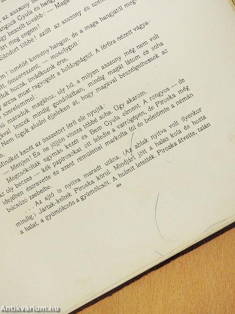 Kaczagva kaczérkodott végig a férfitársasággal, aztán kis huga és Sándor közé állott, a kik még mindig azon voltak, hogy egymást kezének csücskét szorongatták és meglehetősen fáztak a szörnyű melegben.