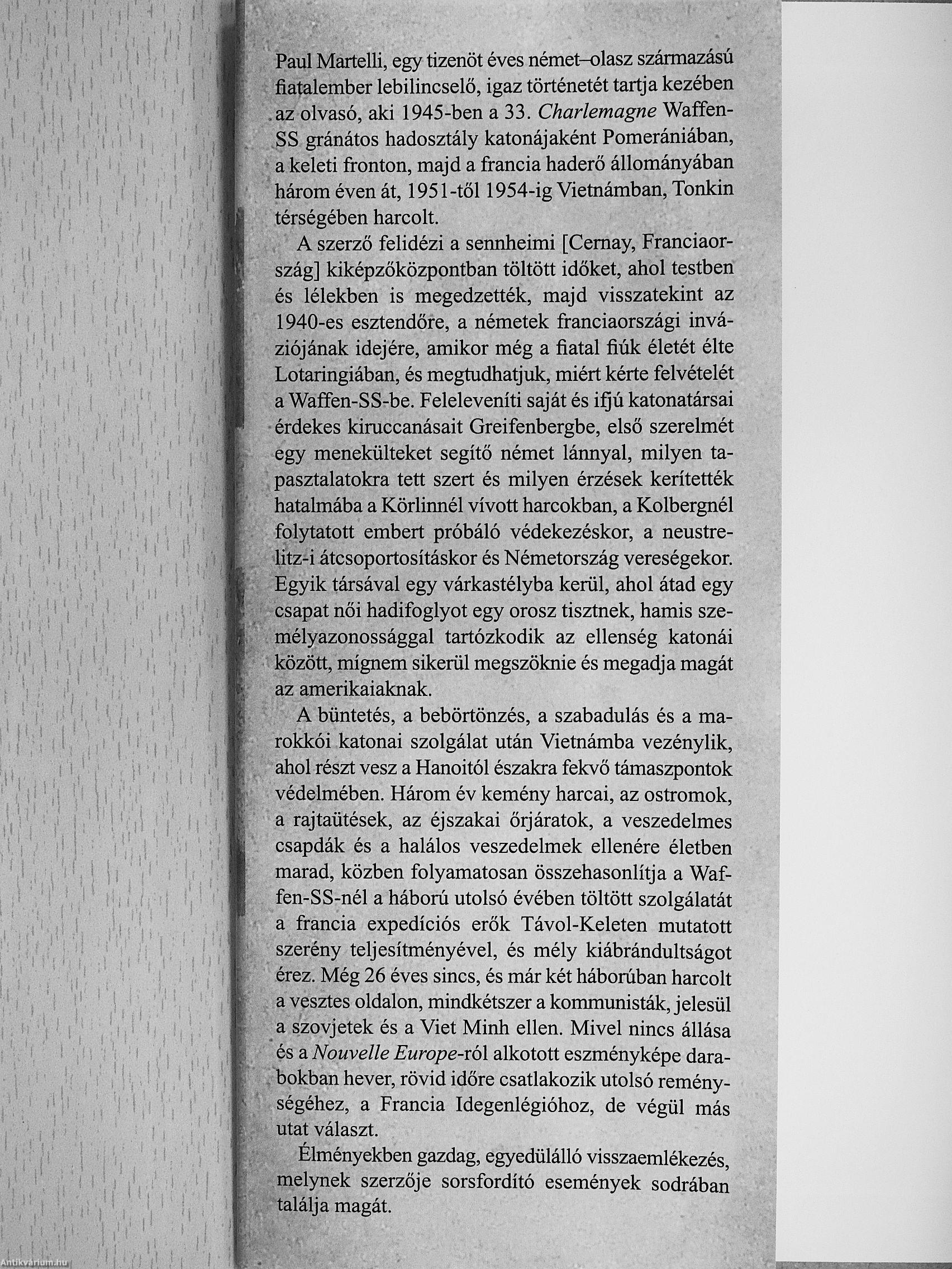 Paul Martelli, egy tizenöt éves német-olasz számiazású fiatalember lebilincselő, igaz történetét tartja kezében .az olvasó, aki 1945-ben a 33. Charlemagne Waffen-SS gránátos hadosztály katonájaként Pomerániában, a keleti fi-onton, majd a francia haderő állományában három éven át, 1951-től 1954-ig Viehiámban, Tonkin térségében harcolt.