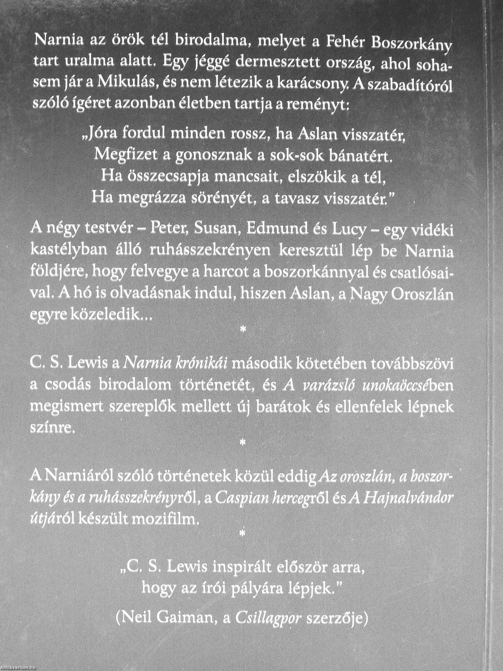 Narnia az örök tél birodalma, melyet a Fehér Boszorkány tart uralma alatt. Egy jéggé dermesztett ország, ahol sohasem jár a Mikulás, és nem létezik a karácsony A szabadítóról szóló ígéret azonban életben tart) a a reményt:
