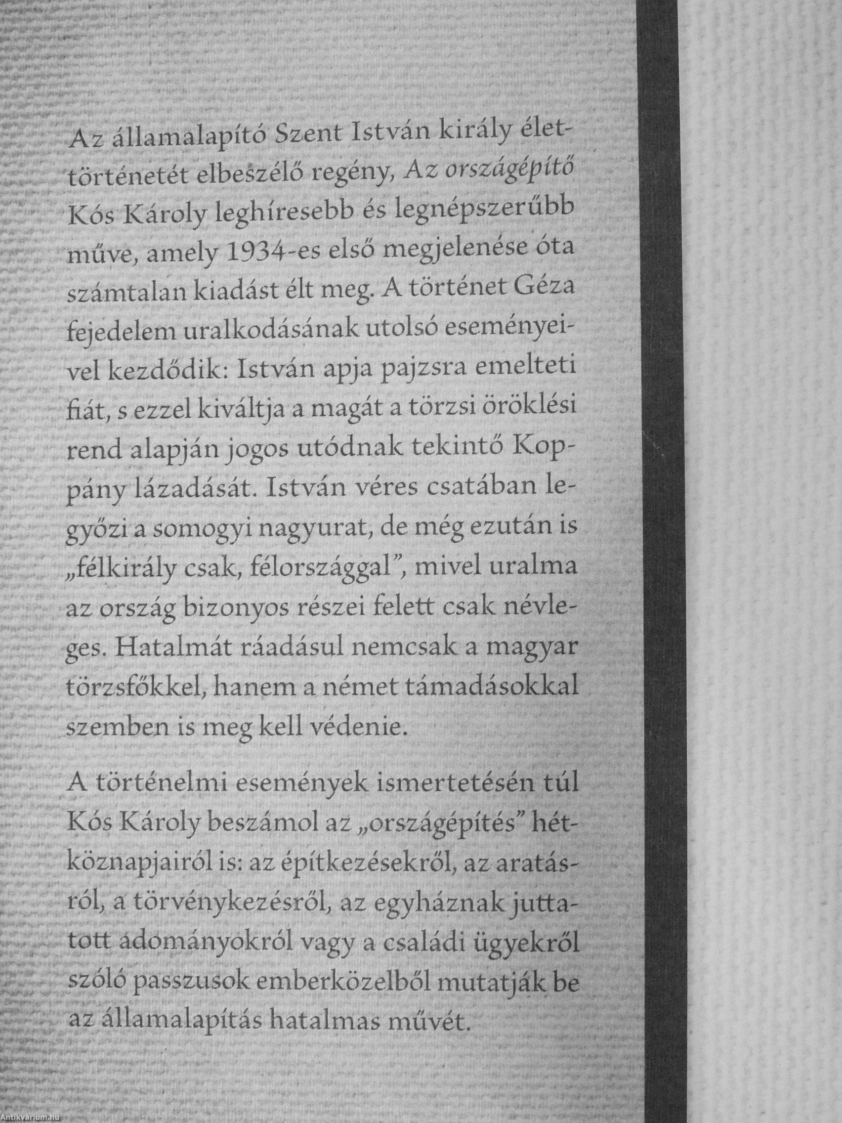 Az államalapító Szent István király élettörténetét elbeszélő regény, Az országépítő Kós Károly leghíresebb és legnépszerűbb műve, amely 1934-es első megjelenése óta számtalan kiadást élt meg. A történet Géza fejedelem uralkodásának utolsó eseményeivel kezdődik: István apja pajzsra emelteti fiát, s ezzel kiváltja a magát a törzsi öröklési rend alapján jogos utódnak tekintő Koppány lázadását. István véres csatában legyőzi a somogyi nagyurat, de még ezután is ,/élkirály csak, félországgal" mivel uralma az ország bizonyos részei felett csak névleges. Hatalmát ráadásul nemcsak a magyar törzsfőkkel, hanem a német támadásokkal szemben is meg kell védenie.