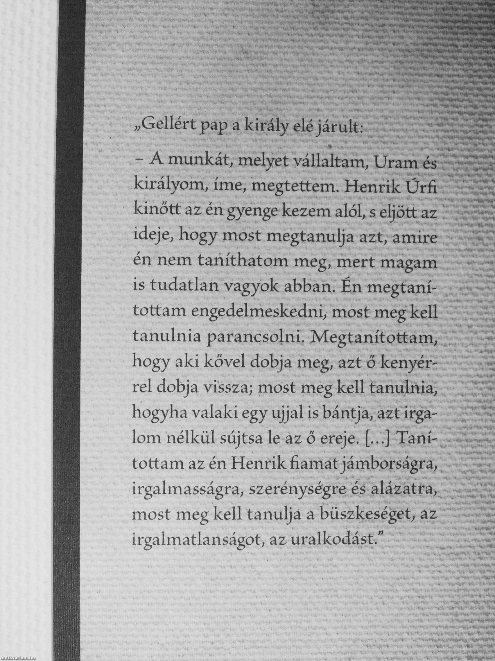 - A munkát, melyet vállaltam, Uram és királyom, íme, megtettem. Henrik Úrfi kinőtt az én gyenge kezem alól, s eljött az ideje, hogy most megtanulja azt, amire én nem taníthatom meg, mert magam is tudatlan vagyok abban. Én megtanítottam engedelmeskedni, most meg kell tanulnia parancsolni. Megtanítottam, hogy aki kővel dobja meg, azt ő kenyérrel dobja vissza; most meg kell tanulnia, hogyha valaki egy ujjal is bántja, azt irgalom nélkül sújtsa le az ő ereje. [ ] Tanítottam az én Henrik fiamat jámborságra, irgalmasságra, szerénységre és alázatra, most meg kell tanulja a büszkeséget, az irgalmatlanságot, az uralkodást."