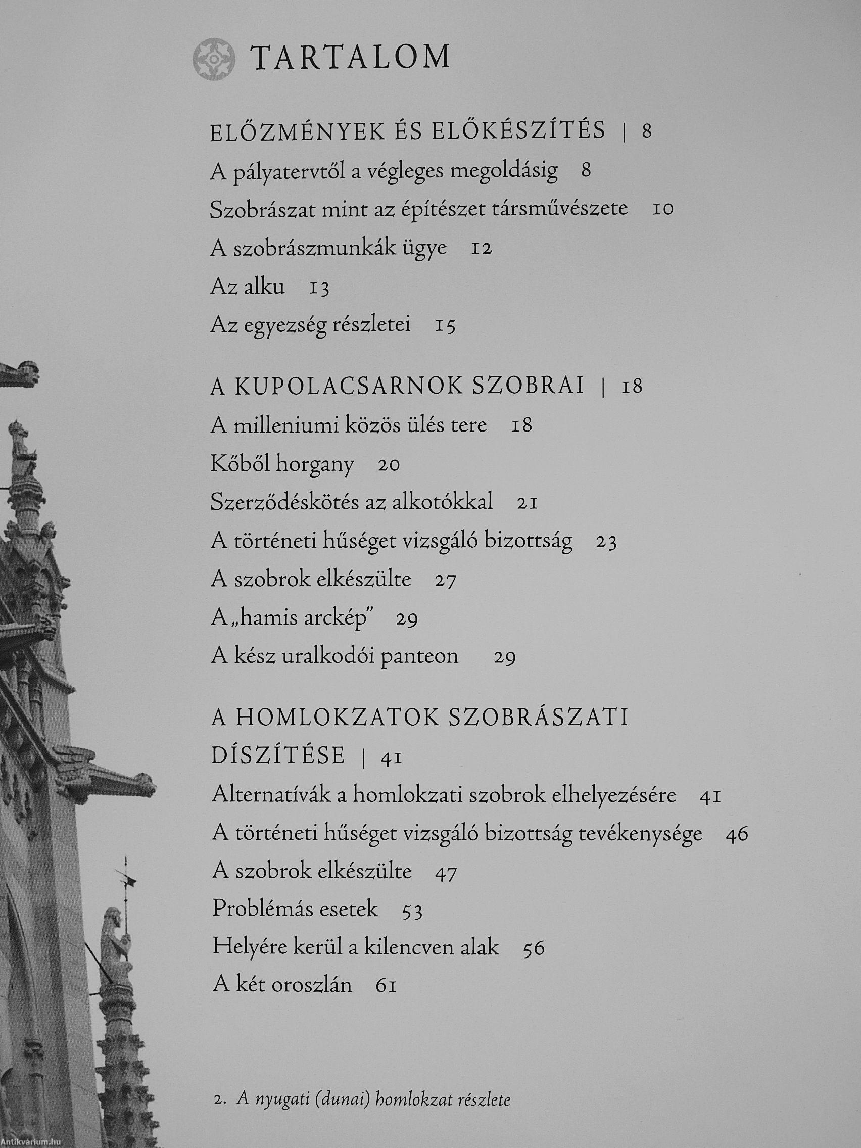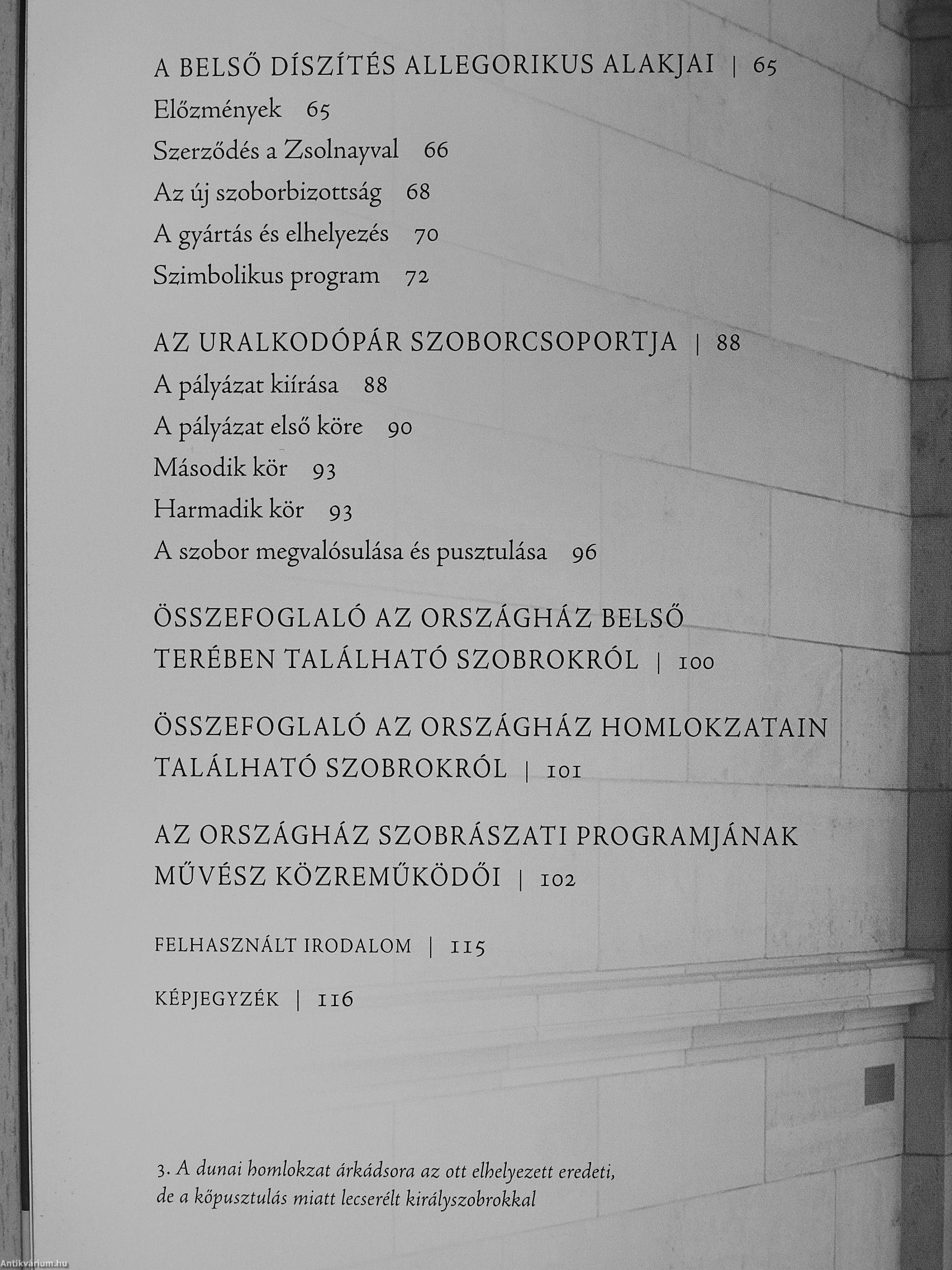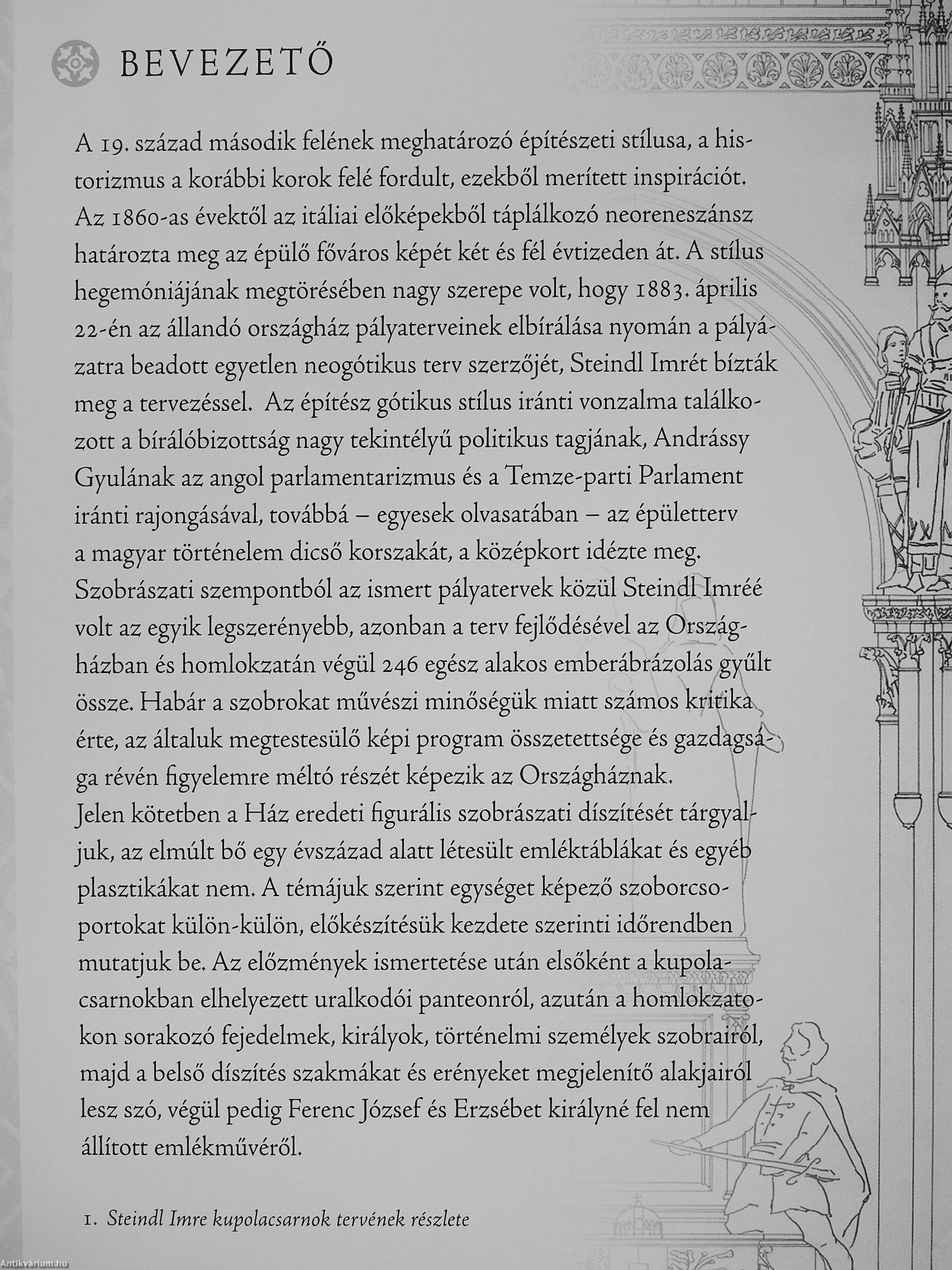 a Ház falai közt képviselt magyaroknak. A könyv elődeihez hasonlóan nemcsak a belső terek megismeréséhez nyújt segítséget, henem az épületet körbejárva kiváló útitárs lehet egy Kossuth téri séta alkalmával is. A korabeli és újonnan készült képekkel egyaránt gazdagon illusztrált szövegnek köszönhetően az olvasó tematikusan ismerkedhet meg a társművészeti alkotások ezen, közel 250 művet számláló csoportjával: a kupolacsarnok tiszteletet parancsoló uralkodóitól az üléstermek és társalgók allegorikus alakjain át a 90 homlokzati szoborig és a főbejáratot őrző oroszlánokig.