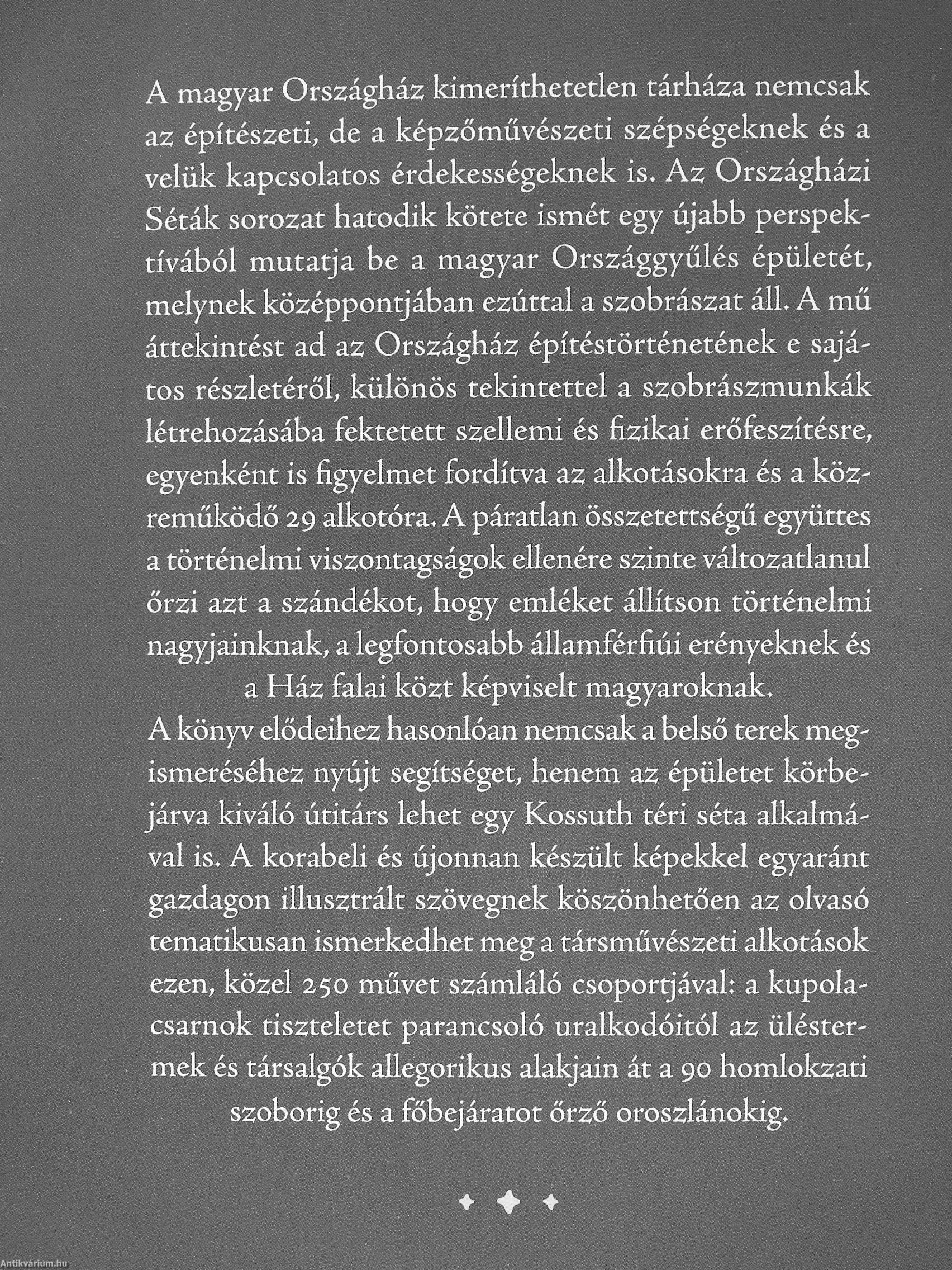 A magyar Országház kimeríthetetlen tárháza nemcsak az építészeti, de a képzőművészeti szépségeknek és a velük kapcsolatos érdekességeknek is. Az Országházi Séták sorozat hatodik kötete ismét egy újabb perspektívából mutatja be a magyar Országgyűlés épületét, melynek középpontjában ezúttal a szobrászat álL A mű áttekintést ad az Országház építéstörténetének e sajátos részletéről, különös tekintettel a szobrászmunkák létrehozásába fektetett szellemi és fizikai erőfeszítésre, egyenként is figyelmet fordítva az alkotásokra és a közreműködő 29 alkotóra. A páratlan összetettségű együttes a történelmi viszontagságok ellenére szinte változatlanul őrzi azt a szándékot, hogy emléket állítson történelmi nagyjainknak, a legfontosabb államférfiúi erényeknek és