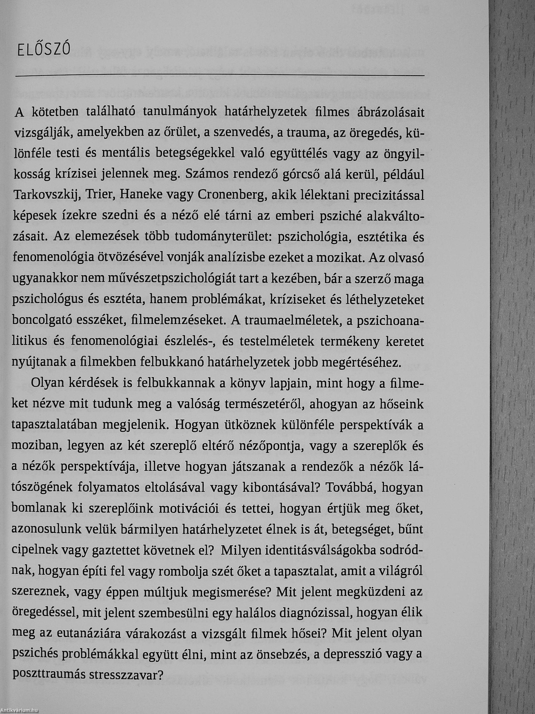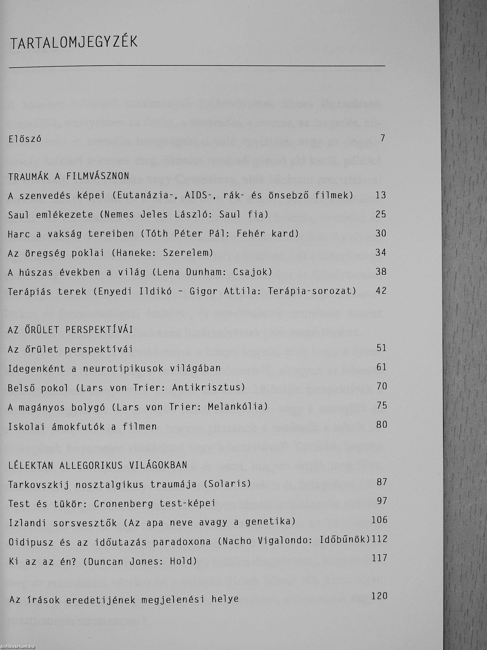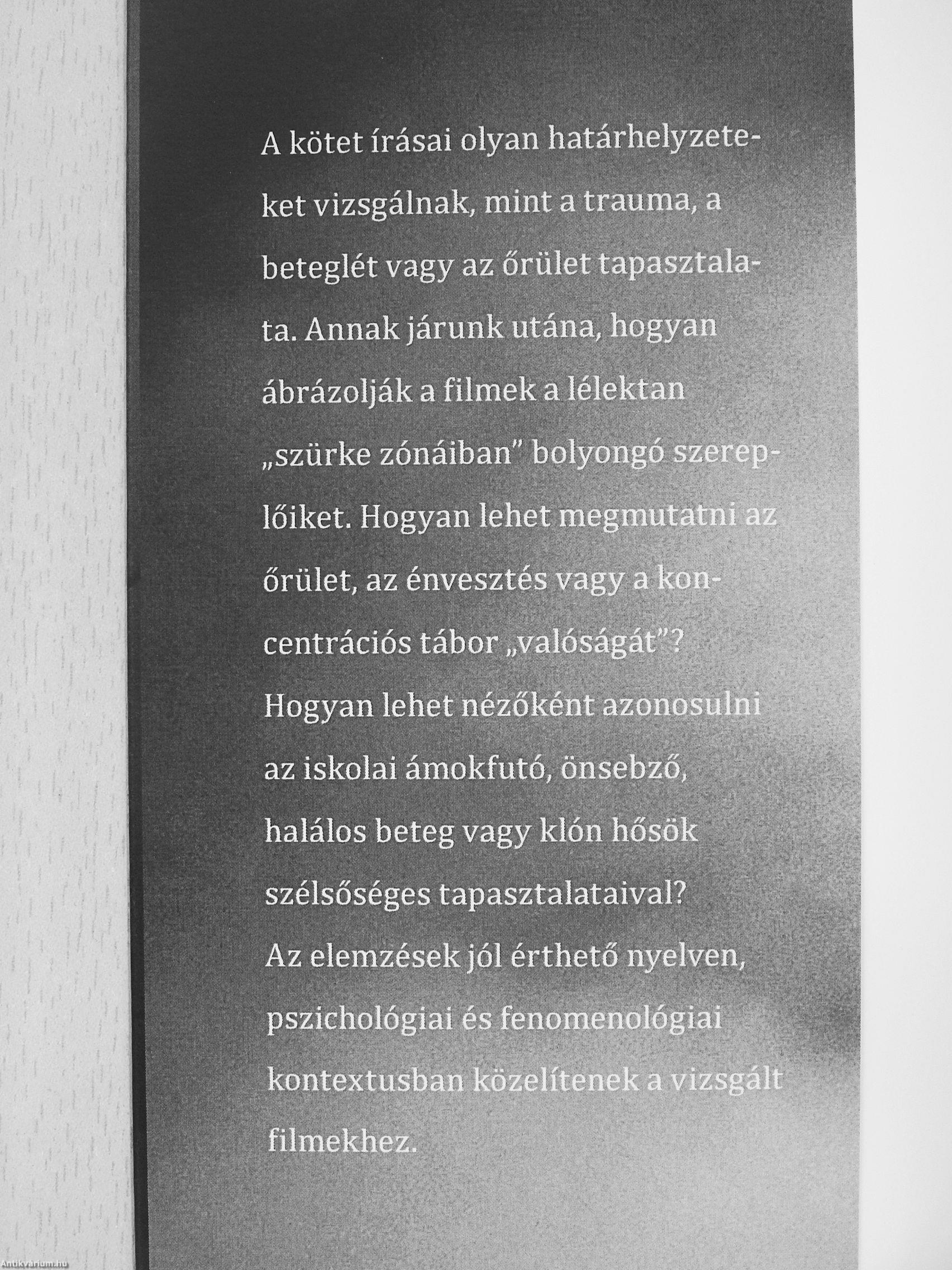 A kötet írásai olyan határhelyzeteket vizsgálnak, mint a trauma, a beteglét vagy az őrület tapasztalata. Annak járunk utána, hogyan i; ábrázolják a filmek a lélektan „szürke zónáiban" bolyongó í lőiket. Hogyan lehet megmutatní?^^ őrület, az énvesztés vagy a kon- ^^ -centrációs tábor „valóságát"? .