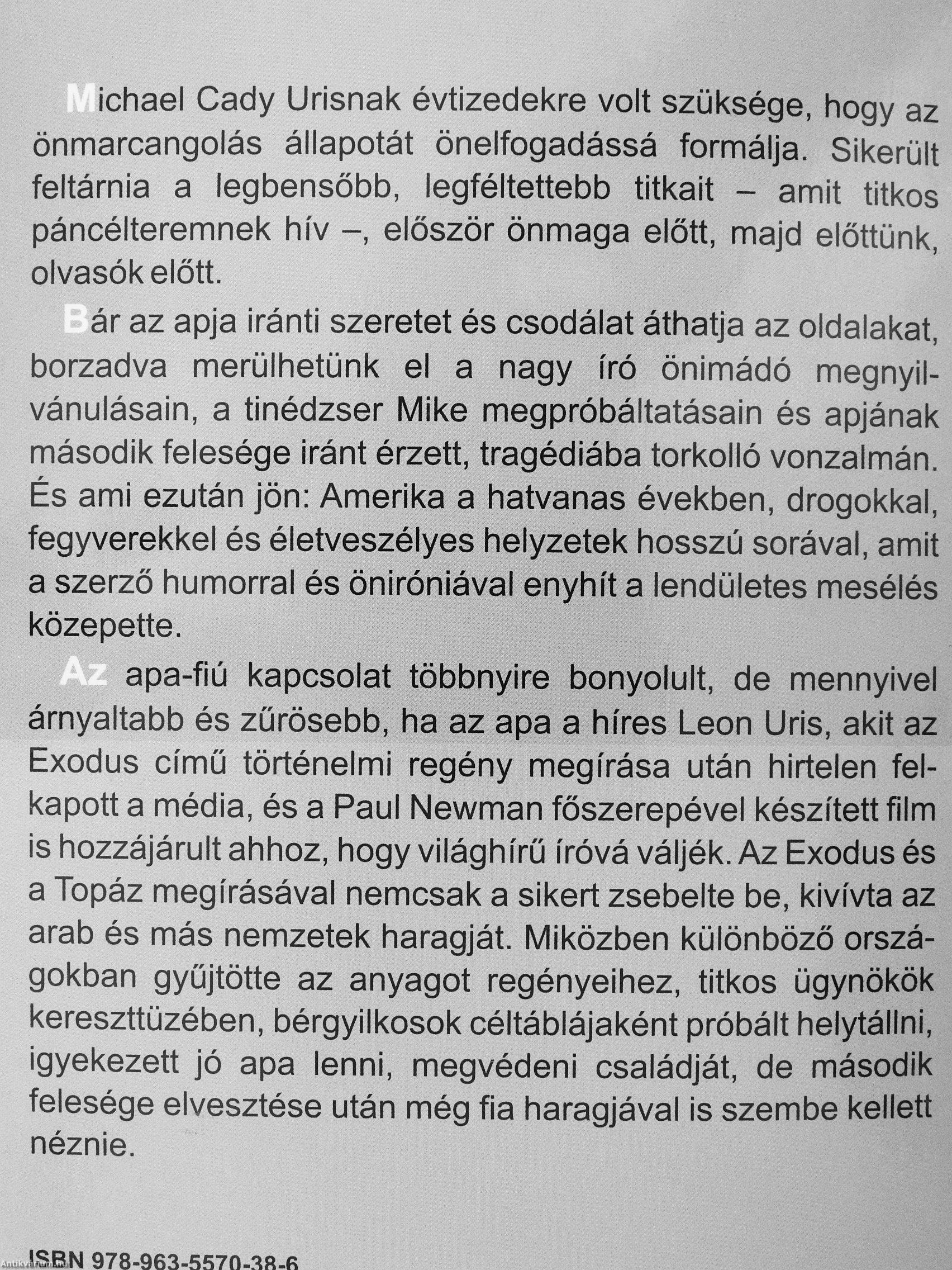 apa-fiú kapcsolat többnyire bonyolult, de mennyivel árnyaltabb és zűrösebb, ha az apa a híres Leon Uris, akit az Exodus című történelmi regény megírása után hirtelen felkapott a média, és a Paul Newman főszerepével készített film is hozzájárult ahhoz, hogy világhírű íróvá váljék. Az Exodus és a Topáz megírásával nemcsak a...