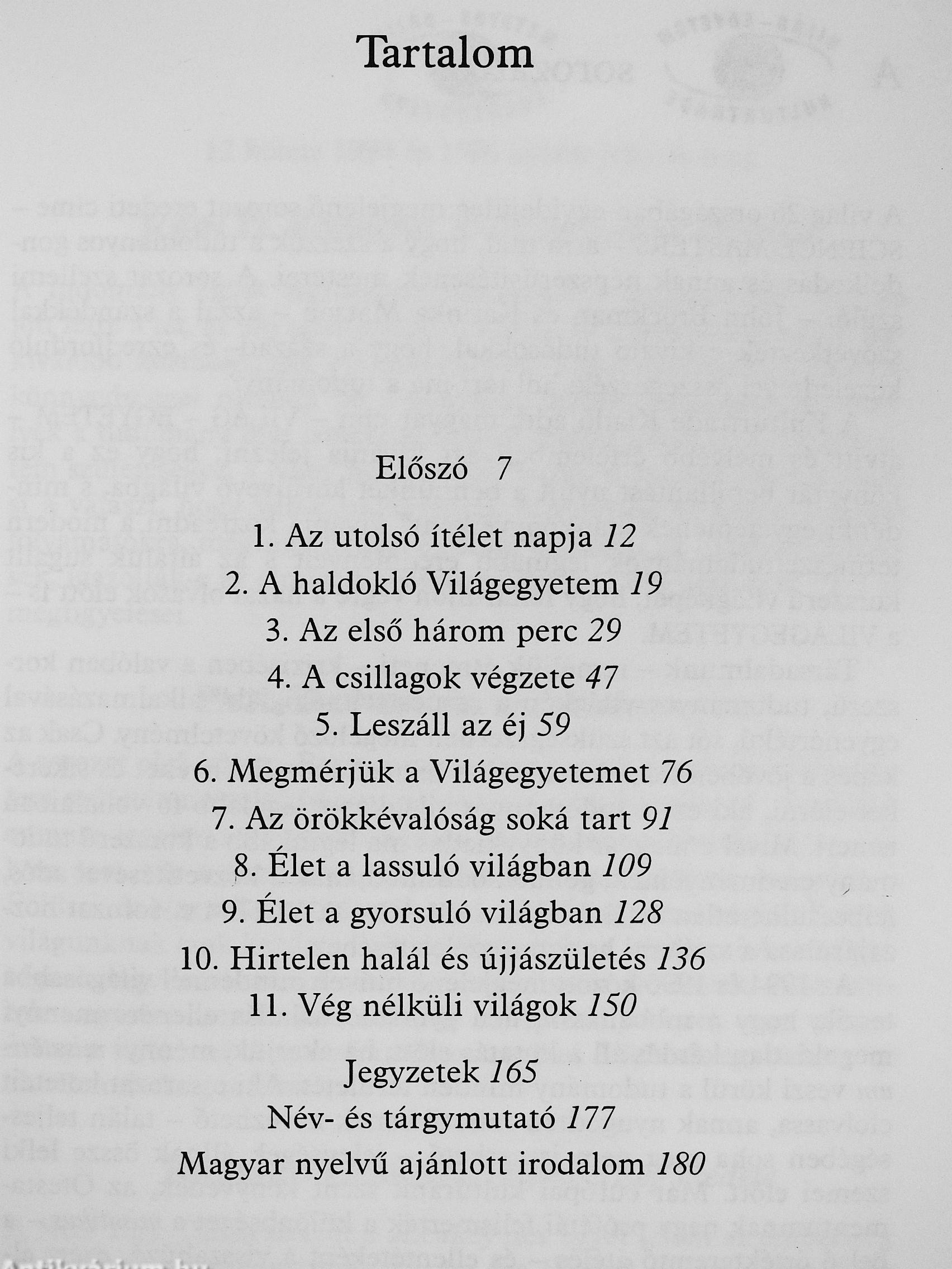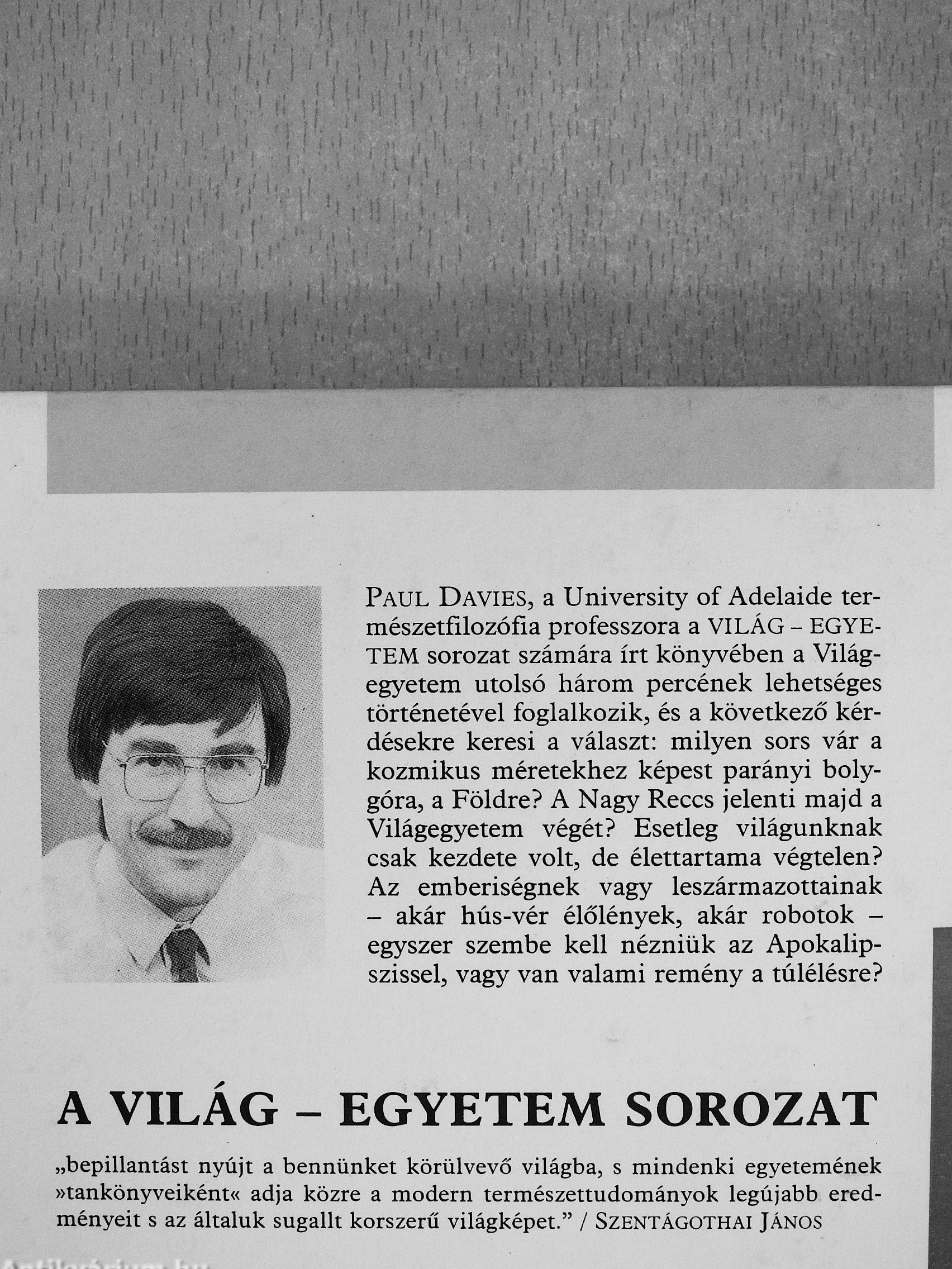 Paul Davies, a University of Adelaide természetfilozófia professzora a világ - egyetem sorozat számára írt könyvében a Világegyetem utolsó három percének lehetséges történetével foglalkozik, és a következő kérdésekre keresi a választ: milyen sors vár a kozmikus méretekhez képest parányi bolygóra, a Földre? A Nagy Reccs jelenti majd a Világegyetem végét? Esetleg világunknak csak kezdete volt, de élettartama végtelen? Az emberiségnek vagy leszármazottainak - akár hús-vér élőlények, akár robotok -egyszer szembe kell nézniük az Apokalipszissel, vagy van valami remény a túlélésre?
