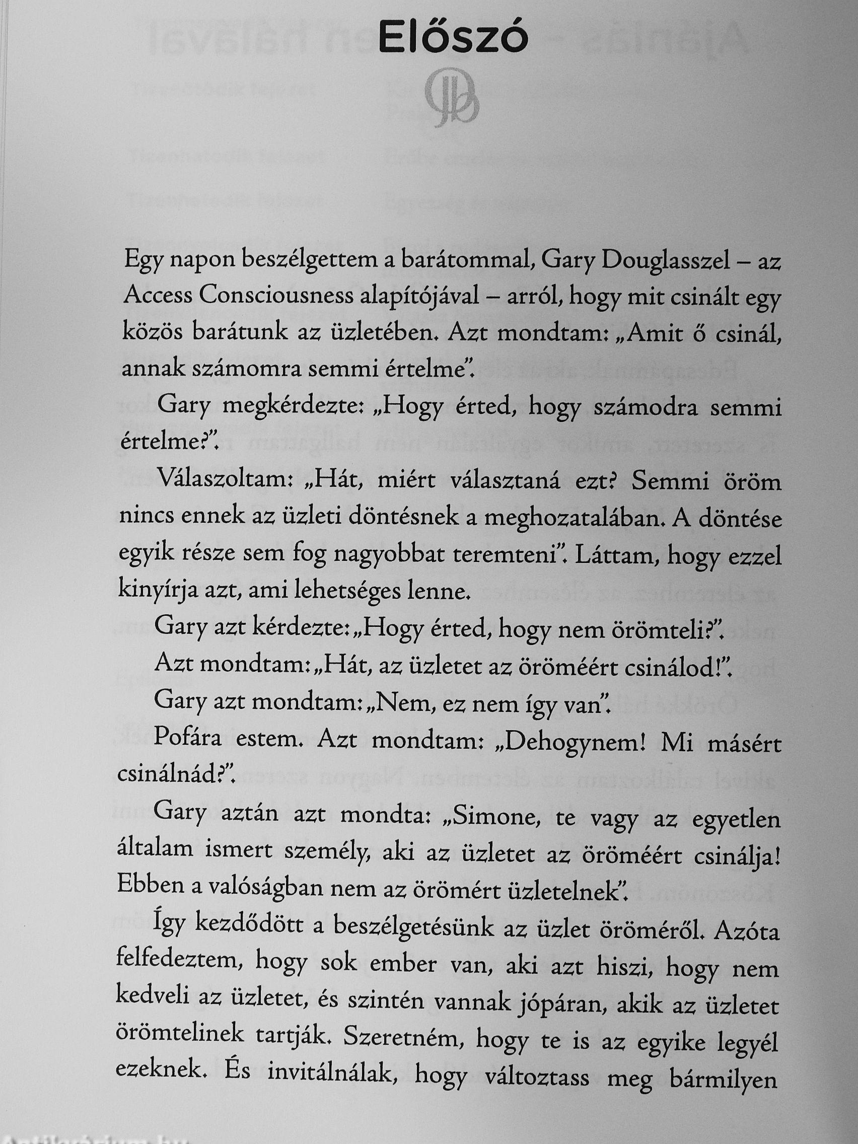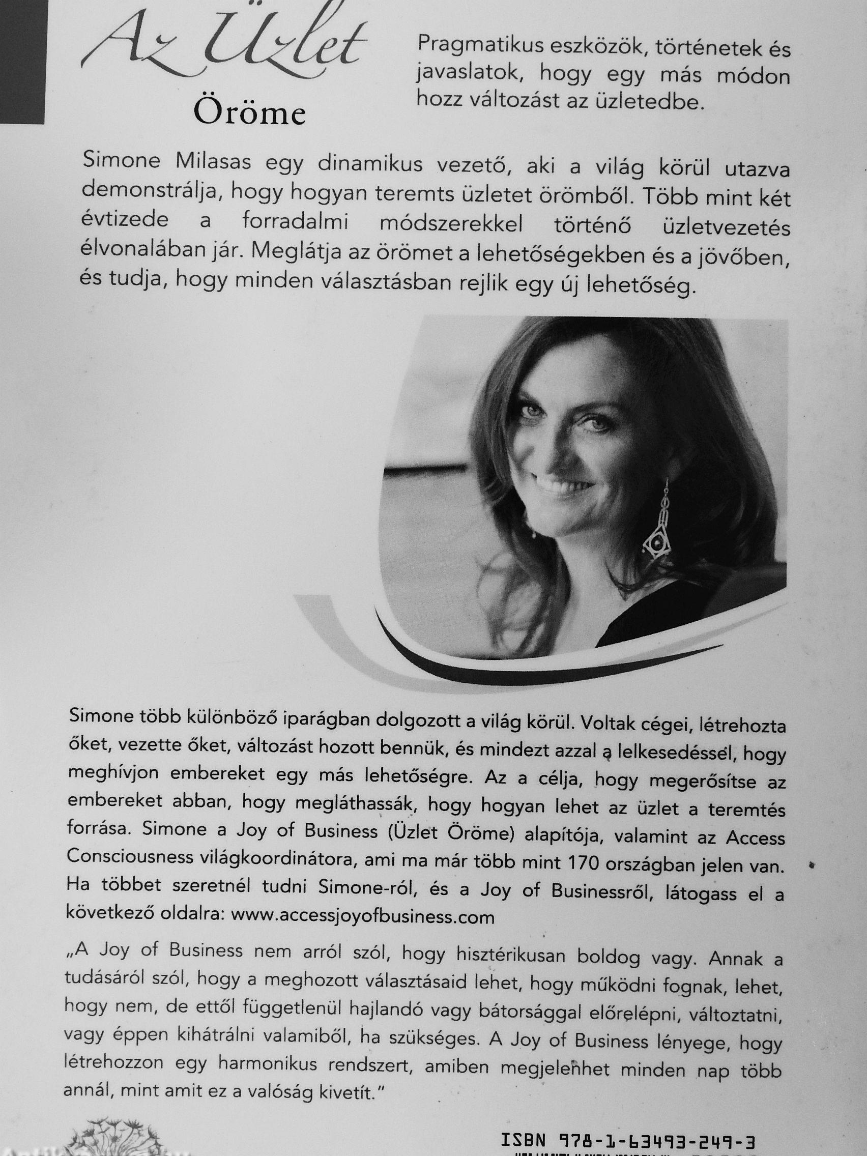 Simoné több különböző iparágban dolgozott a világ körül. Voltak cégei, létrehozta őket, vezette őket, változást hozott bennük, és mindezt azzal ^ lelkesedéssél, hogy meghívjon embereket egy más lehetőségre. Az a célja, hogy megerősítse az embereket abban, hogy megláthassák, hogy hogyan lehet az üzlet a teremtés forrása. Simoné a Joy of Business (Üzlet Öröme) alapítója, valamint az Access Consciousness világkoordinátora, ami ma már több mint 170 országban jelen van. Ha többet szeretnél tudni Simone-ról, és a Joy of Businessről, látogass el a következő oldalra: www.accessjoyofbusiness.com
