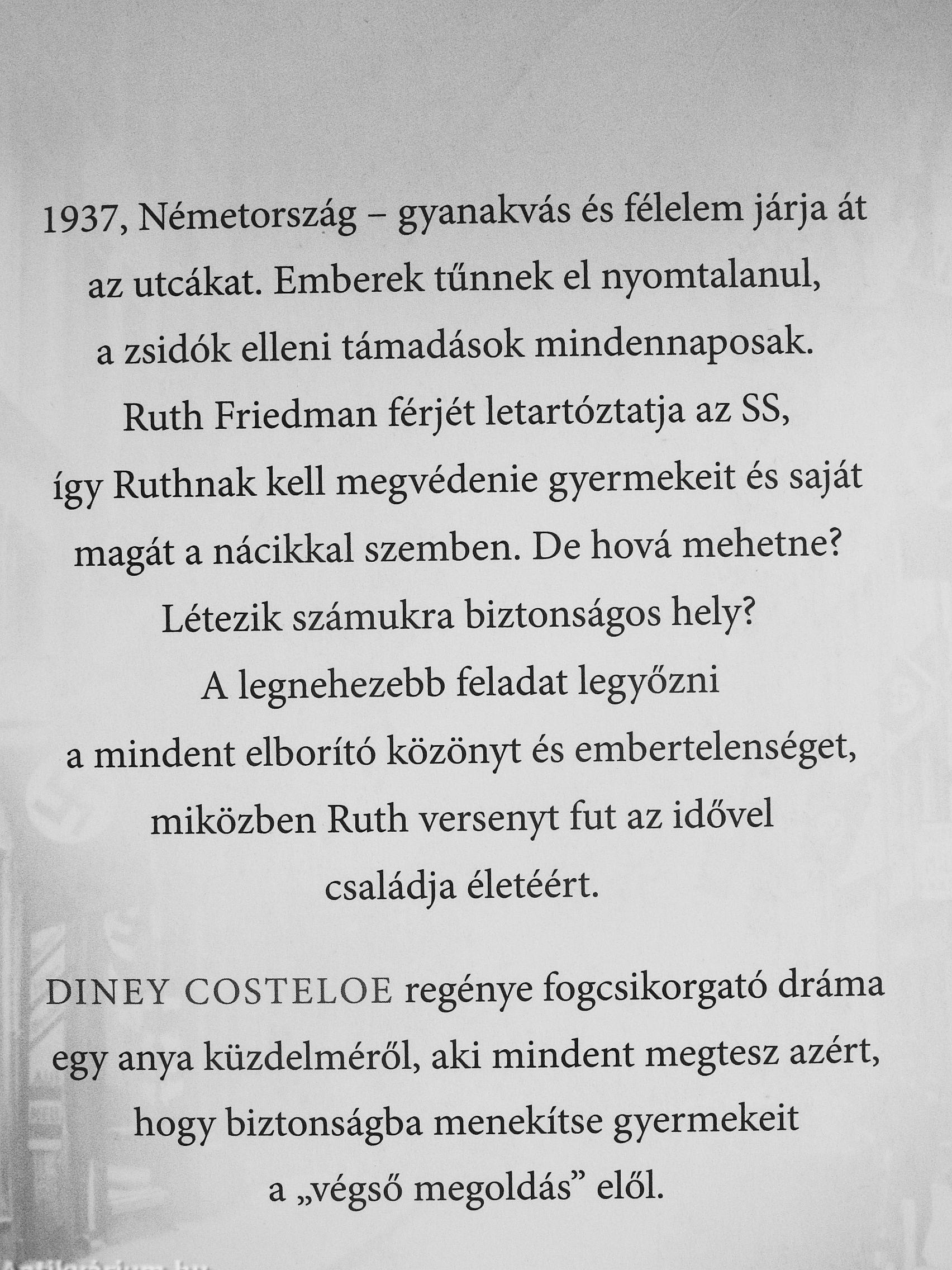 DINEY COSTELOE regénye fogcsikorgató dráma egy anya küzdelméről, aki mindent megtesz azért, hogy biztonságba menekítse gyermekeit a „végső megoldás" elől.