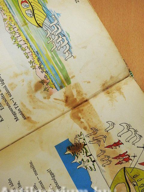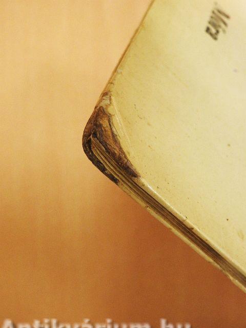 A lapok nedvességtől foltosak, a borító élei sérültek és a gerinc vászonnal pótolt.