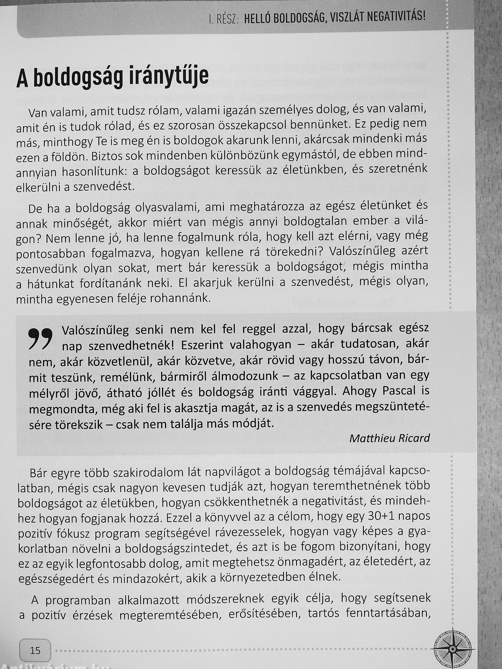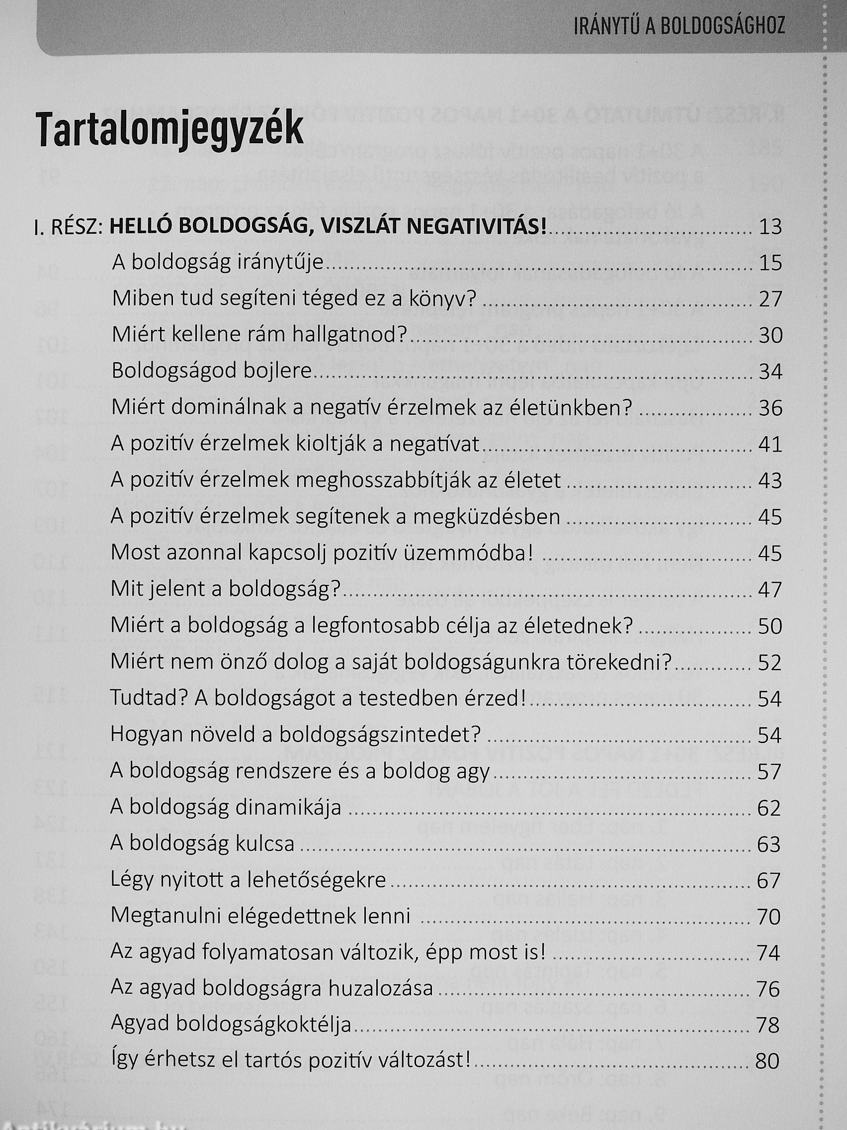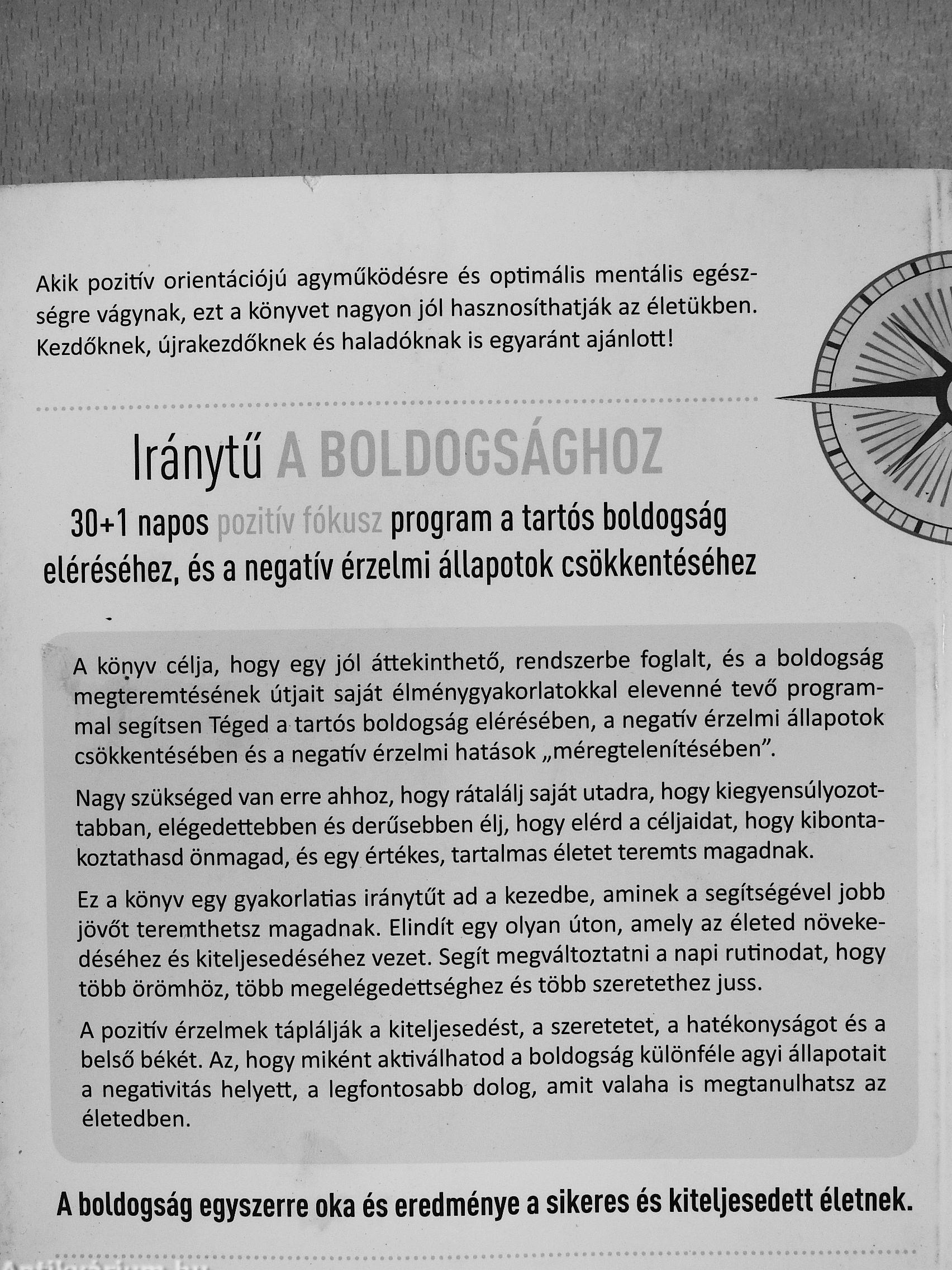 A könyv célja, hogy egy jól áttekinthető, rendszerbe foglalt, és a boldogság megteremtésének útjait saját élménygyakorlatokkal elevenné tevő programmal segítsen Téged a tartós boldogság elérésében, a negatív érzelmi állapotok csökkentésében és a negatív érzelmi hatások „méregtelenítésében".