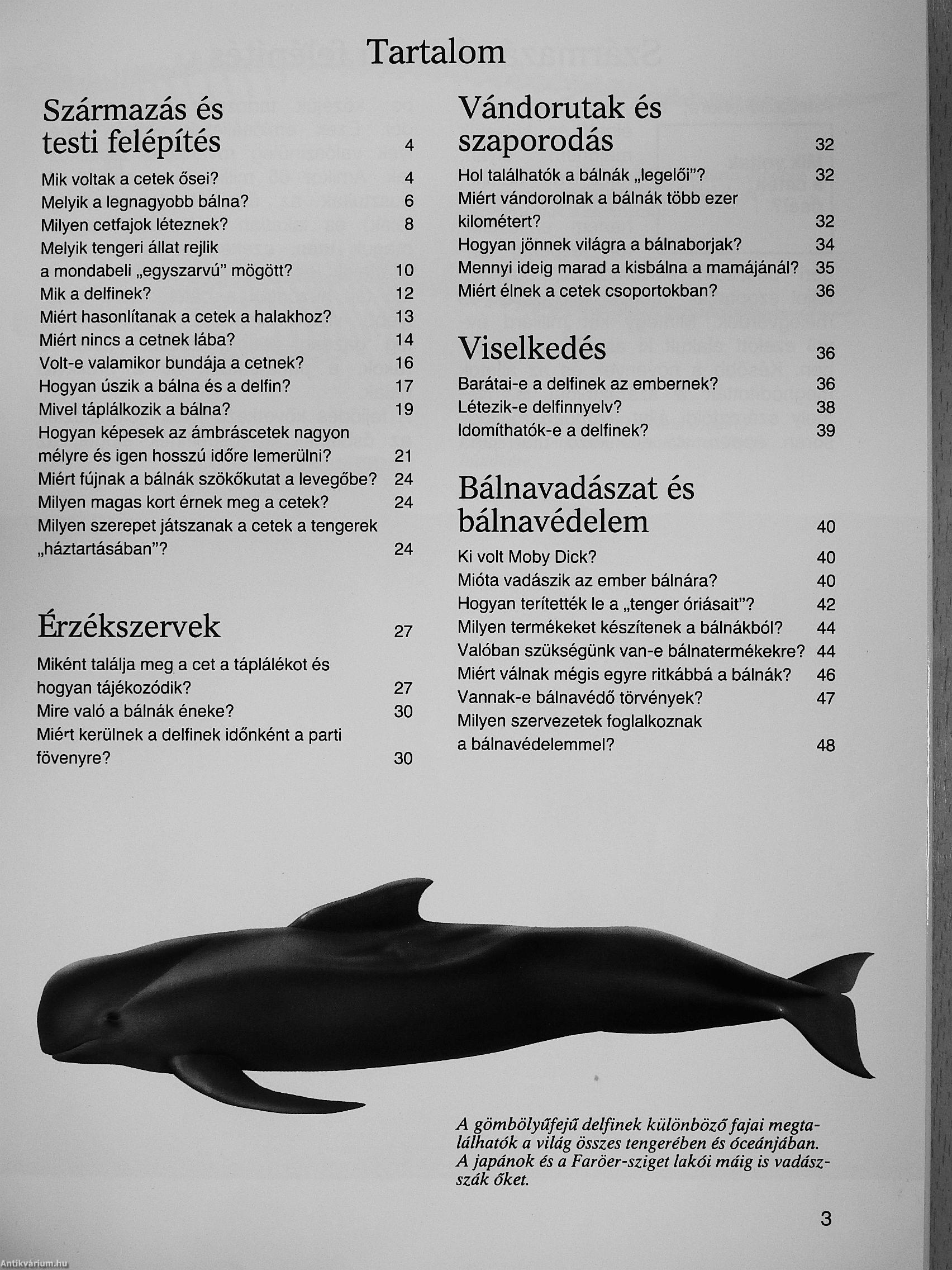 Az ember végveszélybe sodorta a bálnákat. Természetvédők és állatbarátok, akárcsak e könyv szerzője, Petra Deimer, a neves tengerbiológus is, elhatározták, hogy felhívják erre az emberek figyelmét, és harcolni fognak az állatok fennmaradásáért. Ezek az intelligens tengeri emlősök a hosszú távú vándorlás és a mélymerülés nagymesterei. Bonyolult, hangvisszaverődésen alapuló tájékozódási rendszerük van, fiatal, sérült vagy beteg társaikat közösen segítik, s több száz kilométer távolságból is megértik egymást. Vajon mit tudnak a tudósok minderről, mennyire ismerik ezeknek a valaha szárazföldi emlősöknek a szokásait, ösztöneit? Mindezeken kívül ebben a könyvben olvashatunk a bálnavadászatokról, a ceteket körüllengő hiedelmekről, Moby Dickről és még sok más Izgalmas kérdésről.