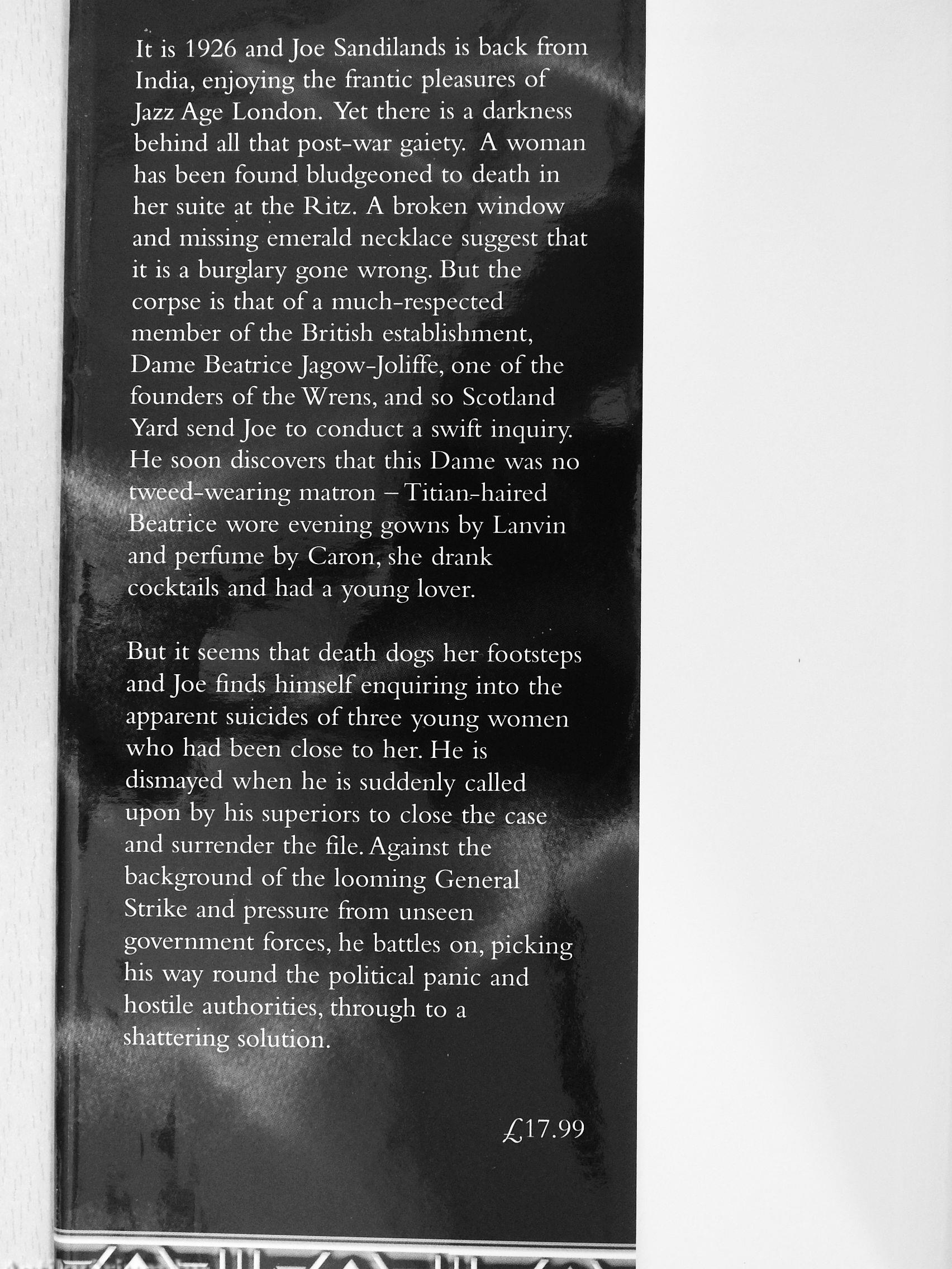 It is 1926 and Joe Sandilands is back from India, enjoying the frantic pleasures of Jazz Age London. Yet there is a darkness behind all that post-war gaiety. A woman has been found bludgeoned to death in her suite at the Ritz. A broken window and missing emerald necklace suggest that it is a burglary gone wrong. But the corpse is that of a much-respected member of the British establishment, Dame Beatrice Jagow-Joliffe, one of the founders of the Wrens, and so Scotland Yard send Joe to conduct a swift inquiry. He soon discovers that this Dame was no y^^,ed-wearing matron - Titian-haired Patrice wore evening gowns by Lanvin and perfume by Caron, she drank cocktails and had a young lover.