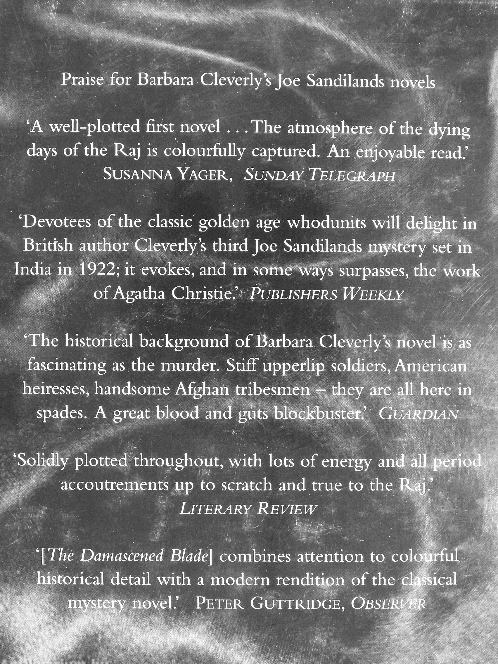 'The historical background of Barbara Cleverly s riovel is i fascinating as the murder. Stiff upperlip soldiers, Americar heiresses, handsome Afghaii tribesmen - they are all here i spades. A great blood and guts blockbustefi' Guardian