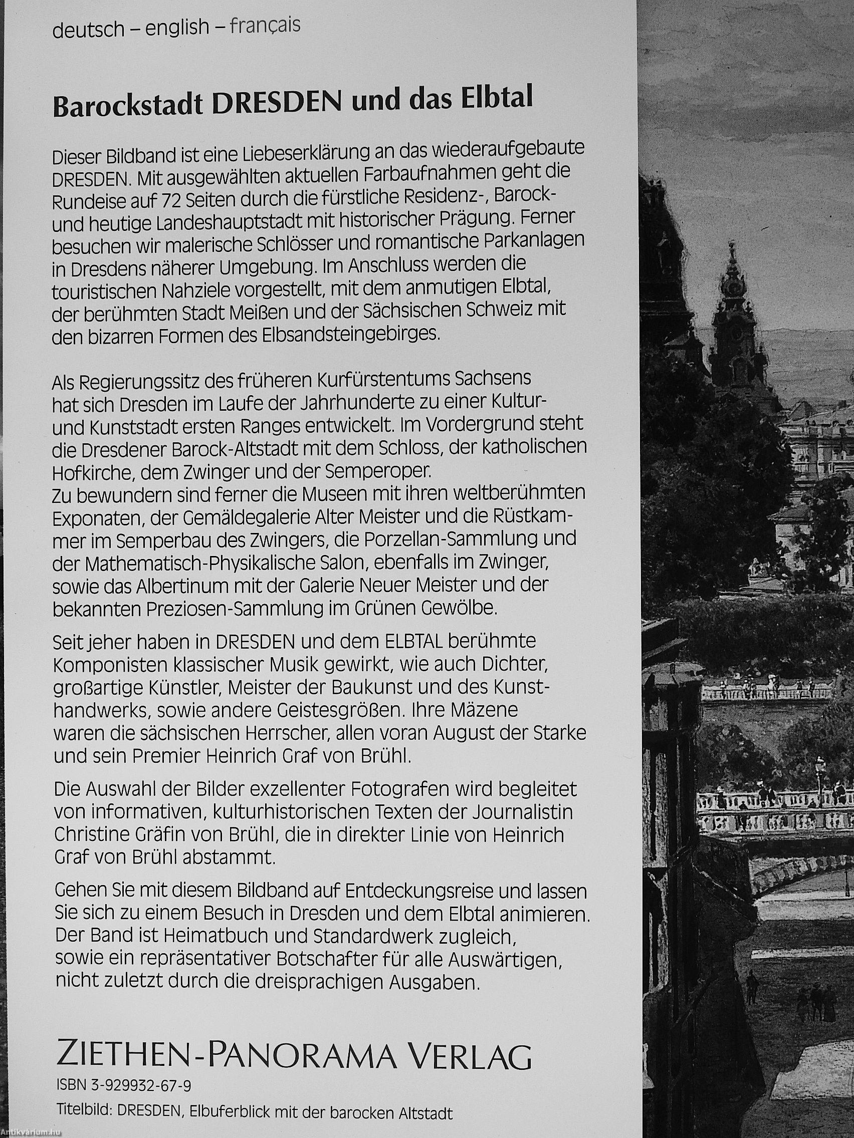 Gehen Sie mit diesem Bildband auf Entdeckungsreise und lassen Sie sich zu einem Besuch in Dresden und dem Elbtal animieren. Der Band ist Heimatbuch und Standardwerk zugleich, sowie ein repräsentativer Botschafter für alle Auswärtigen, nicht zuletzt durch die dreisprachigen Ausgaben.