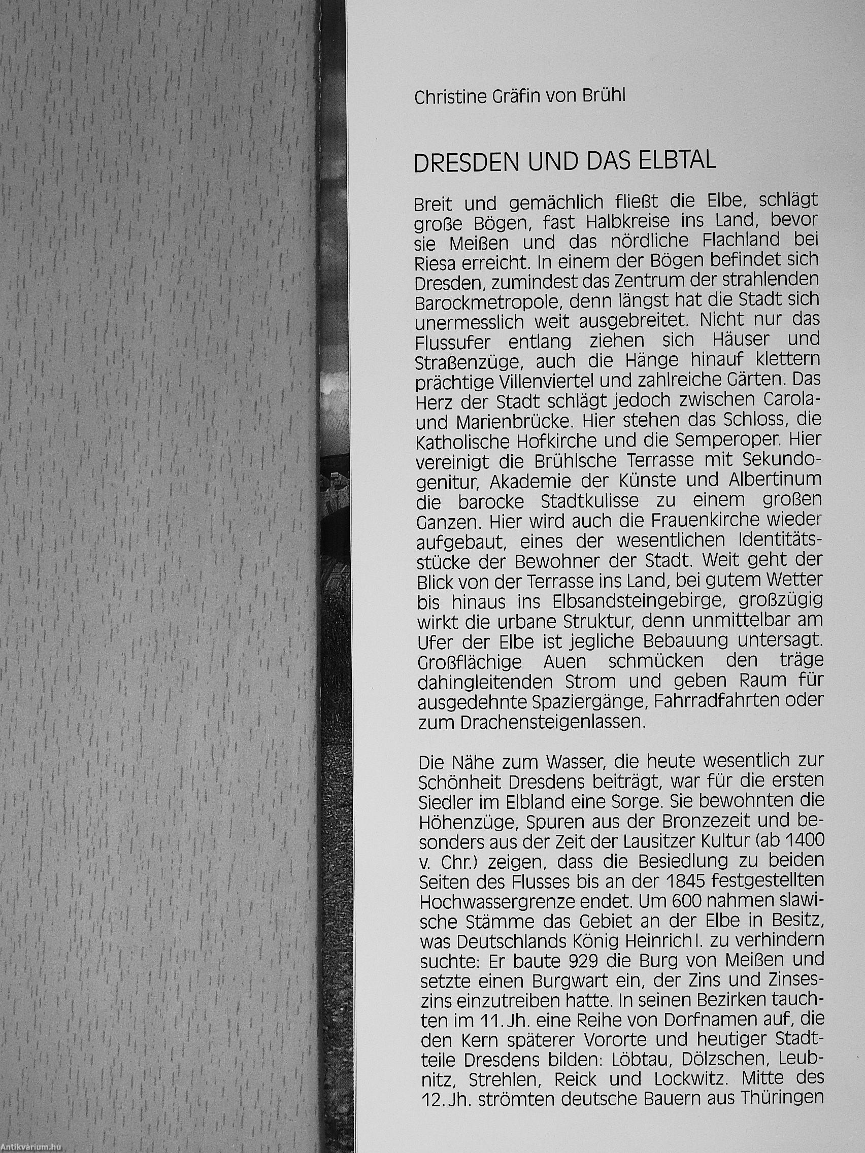 Breit und gemächiicli fließt die Eibe, schiägt große Bögen, fast Halblreise ins Land, bevor sie iVleißen und das nördiiclne Flachiand bei Riesa erreiclit. In einem der Bögen befindet sicli Dresden, zumindest das Zentrum der stralnienden Baroclmetropoie, denn längst hat die Stadt sich unermesslich weit ausgebreitet. Nicht nur das Flussufer entlang ziehen sich Häuser und Straßenzüge, auch die Hänge hinauf lettern prächtige Villenviertel und zahlreiche Gärten. Das Herz der Stadt schlägt jedoch zwischen Carola-und Marienbrücle. Hier stehen das Schloss, die Katholische Hoflirche und die Semperoper Hier vereinigt die Brühische Terrasse mit Sekundo-genitur, Alademie der Künste und Albertinum die barocke Stadtkulisse zu einem großen Ganzen. Hier wird auch die Frauenkirche wieder aufgebaut, eines der wesentlichen Identitätsstücke der Bewohner der Stadt. Weit geht der Blick von der Terrasse ins Land, bei gutem Wetter bis hinaus ins Elbsandsteingebirge, großzügig wirkt die Urbane Struktur, denn unmittelbar am Ufer der Elbe ist jegliche Bebauung untersagt. Großflächige Auen schmücken den träge dahingleitenden Strom und geben Raum für ausgedehnte Spaziergänge, Fahrradfahrten oder zum Drachensteigenlassen.