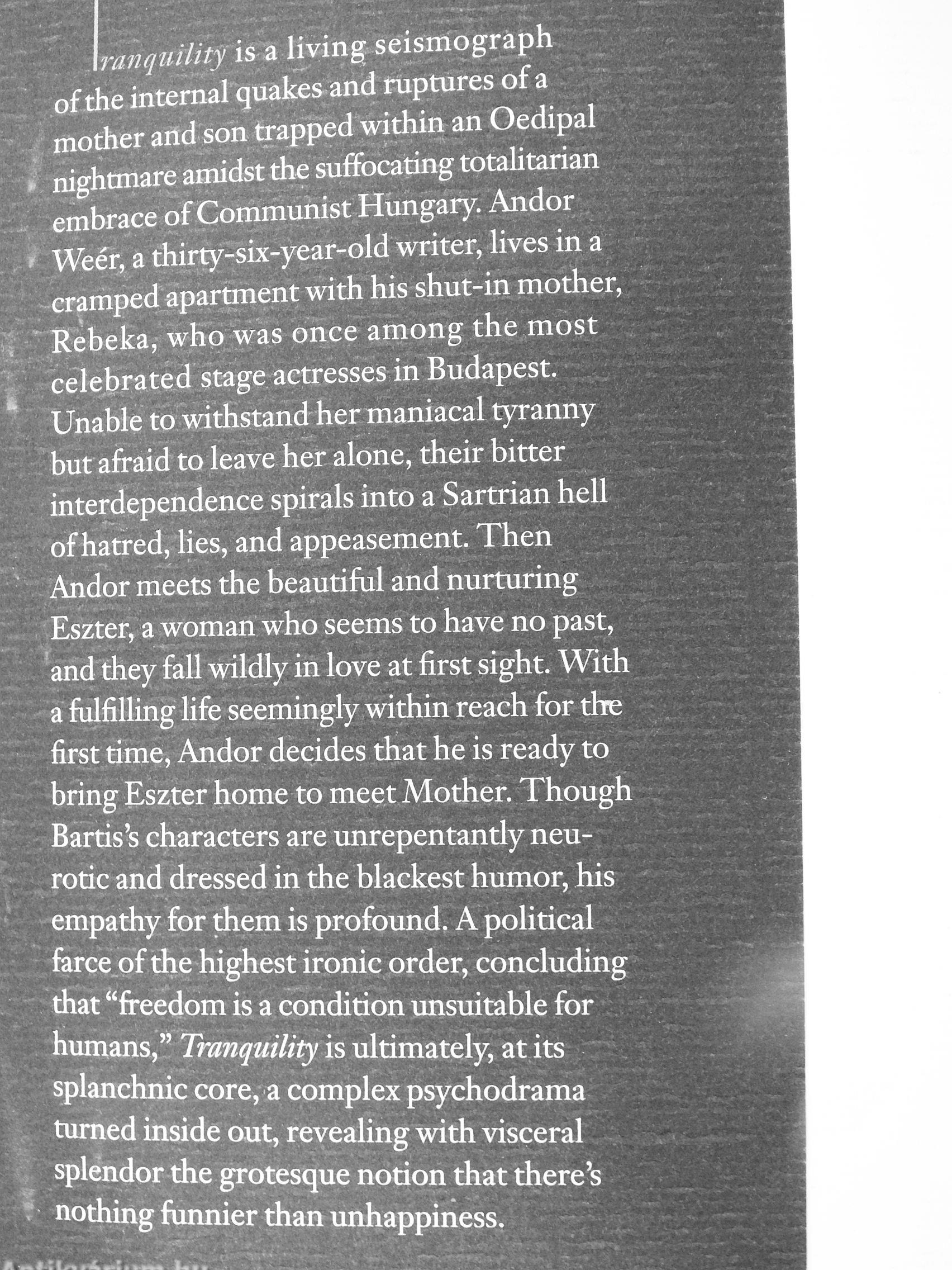 cramped apartment with his shut-in mother, ' Rebeka, who was once among the most , celebrated stage actresses in Budapest. Unable to withstand her maniacal tyranny but afraid to leave her alone, their bitter interdependence spirals into a Sartrian hell of hatred, Hes, and appeasement. Then Andor meets the beautiful and nurturing Eszter, a woman who seems to have no past, and they fall wildly in love at first sight. With a fulfilling life seemingly within reach for the first time, Andor decides that he is ready to bring Eszter home to meet Mother. Though Bartis's characters are unrepentantly neurotic and dressed in the blackest humor, his empathy for them is profound, A political force of the highest ironic order, concluding that "freedom is a condition unsuitable for humans," Tranquility is ultimately, at its splanchnic core, a complex psychodrama turned inside out, reveahng with visceral splendor die grotesque notion tiiat there's nothing ftmnier than unhappiness.