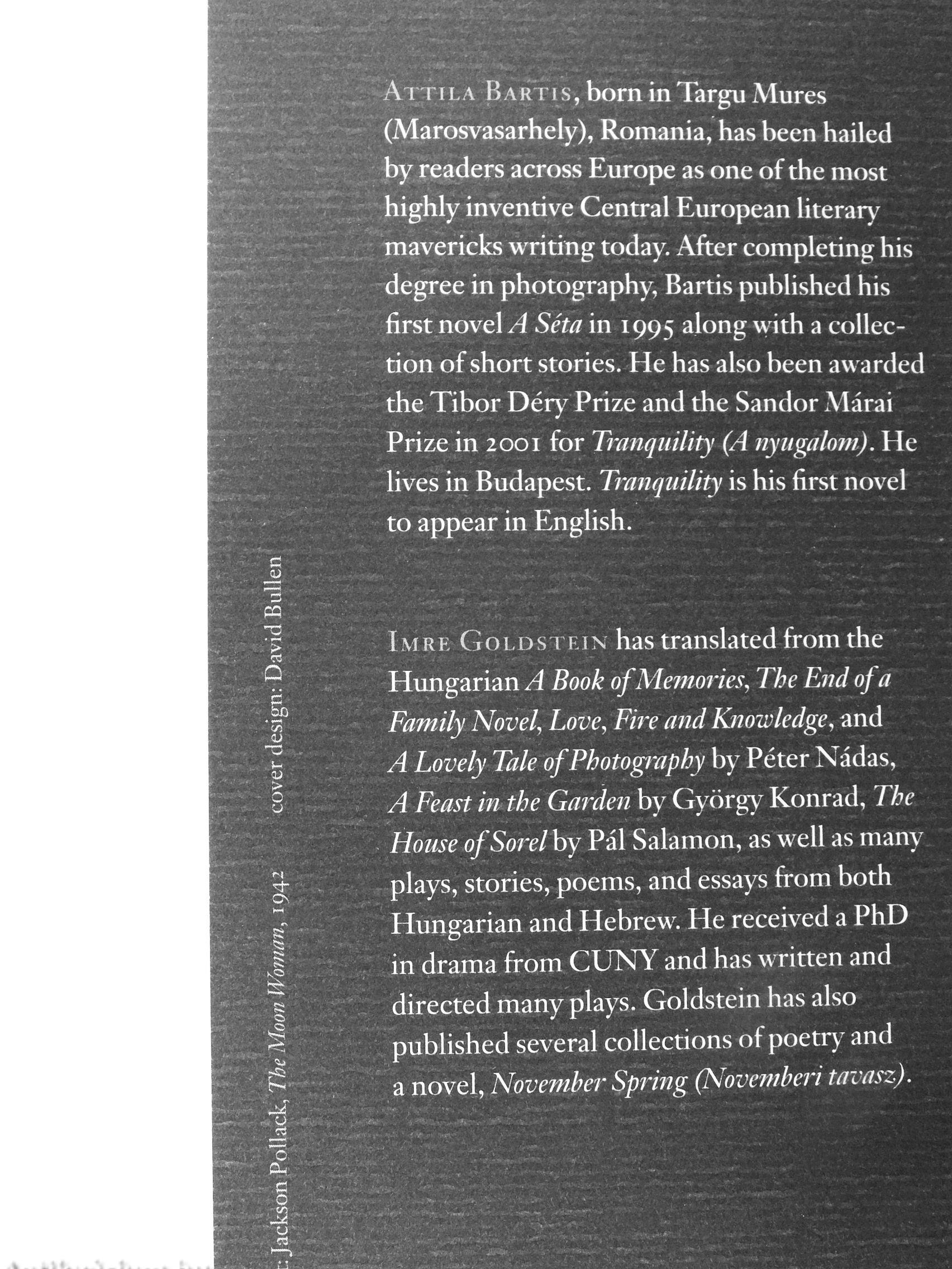 Attila Bartis, born inTargu Mures (Marosvásárhely), Romania, has been hailed by readers across Europe as one of the most highly inventive Central European literary mavericks writing today. After completing his degree in photography, Bartis published his first novel A Séta in 1995 along with a collection of short stories. He has also been awarded the Tibor Déry Prize and the Sandor Márai Prize in 2001 for Tranquility (A nyugalom). He hves in Budapest. Tranquility is his first novel to appear in English.