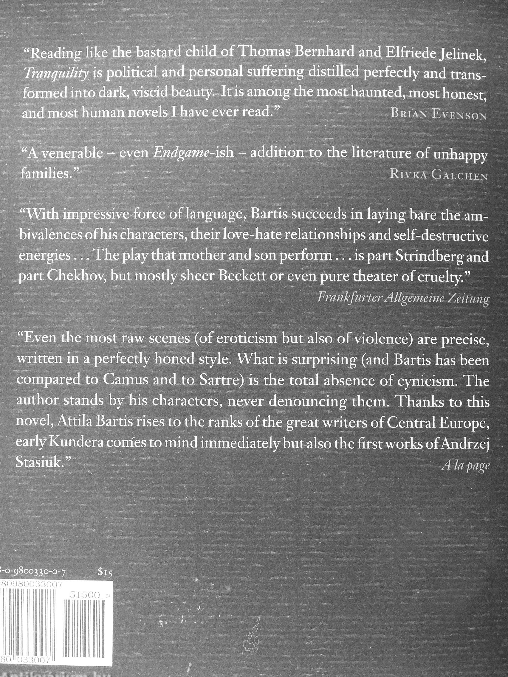 "Reading like die bastard child of Thomas Bernhard and, Elfriede Jelinek, Tranquility js political and personal suffering distilled perfectiy and transformed into dark, viscid beauty. It is among the mos t haunted, most honest, and most human novels I have ever read." " Bri an Evenson
