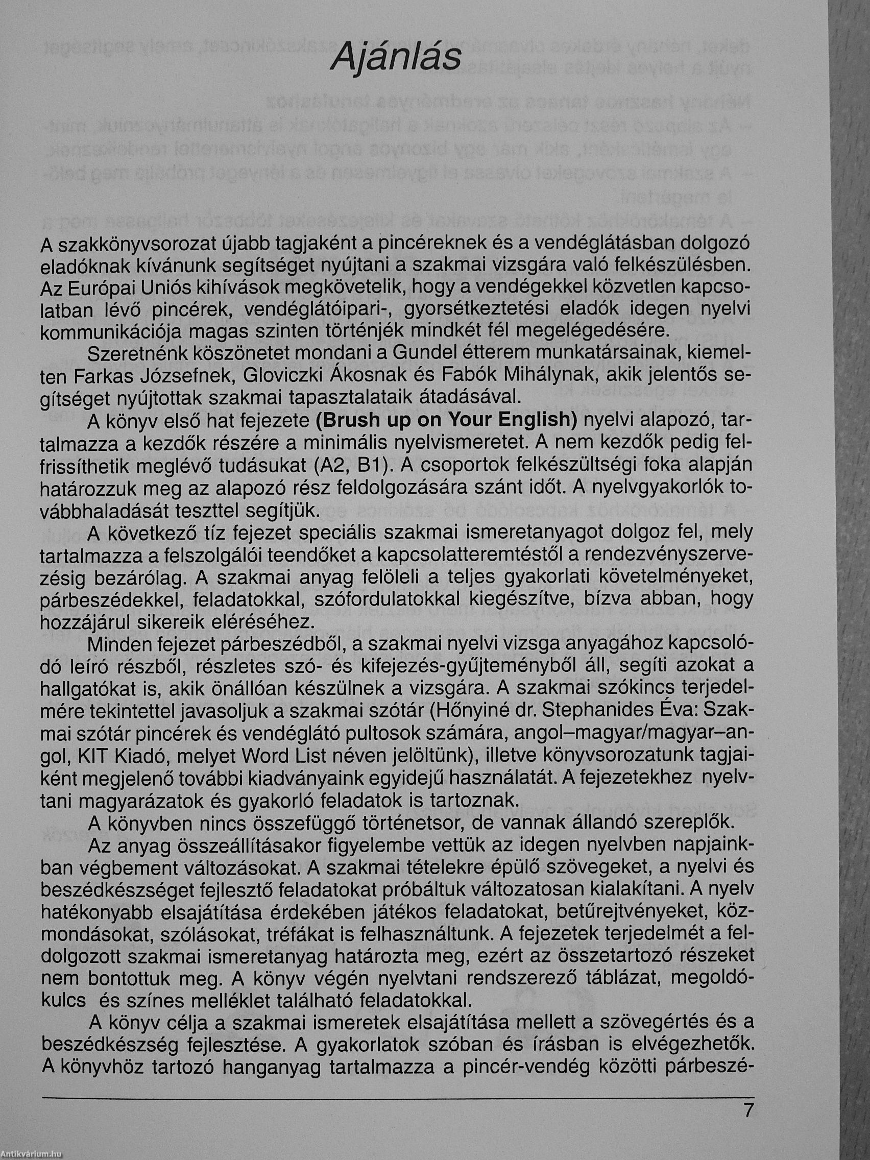 Bár a könyv magyar anyanyelvűek részére íródott, érdekes lehet azonban az angol nyelvet beszélők számára is, akik a majdani éttermi vezetők, konyhafőnökök, valamint egyéb vendéglátósok csoporQát fogják képezni.