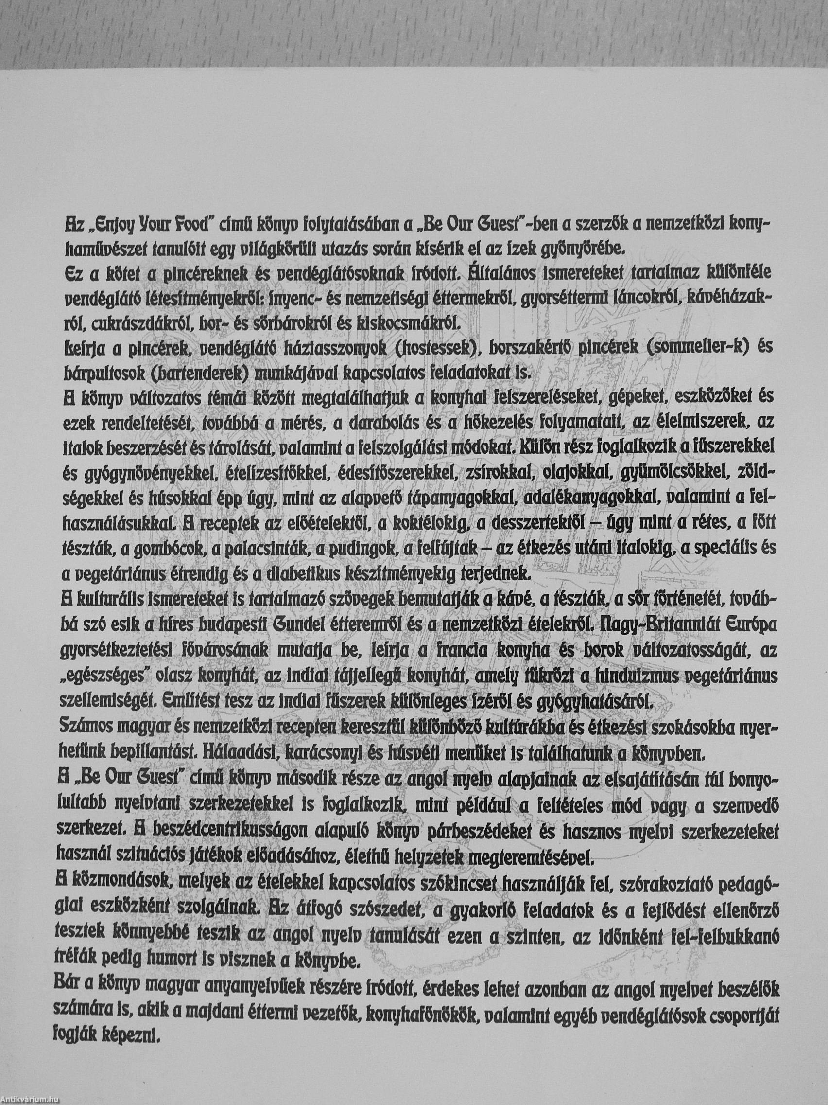 Bz .Cn|oy Vour Food' dmű f(9nyp folyíaíásáíxin a .Be Our 6uesf-ben a szerzők a nemzetkOzl kony-hamÜDészet íanuI6lí egy DlIágkCrOll utazás során kísérik el az ízek gyOnyOréfie. Sz a kOíet a pincéreknek és oendéglátósoknak írödott. általános Ismereteket tartalmaz küIOnféle Dendéglátő léíesftményekrei: ínyenc- és nemzetis^ éttermekről, gyorséttermi láncokrfil, kávéházakról, cukrászdákr6I, bor- és s6ií)ároki6I és kiskocsmákról.