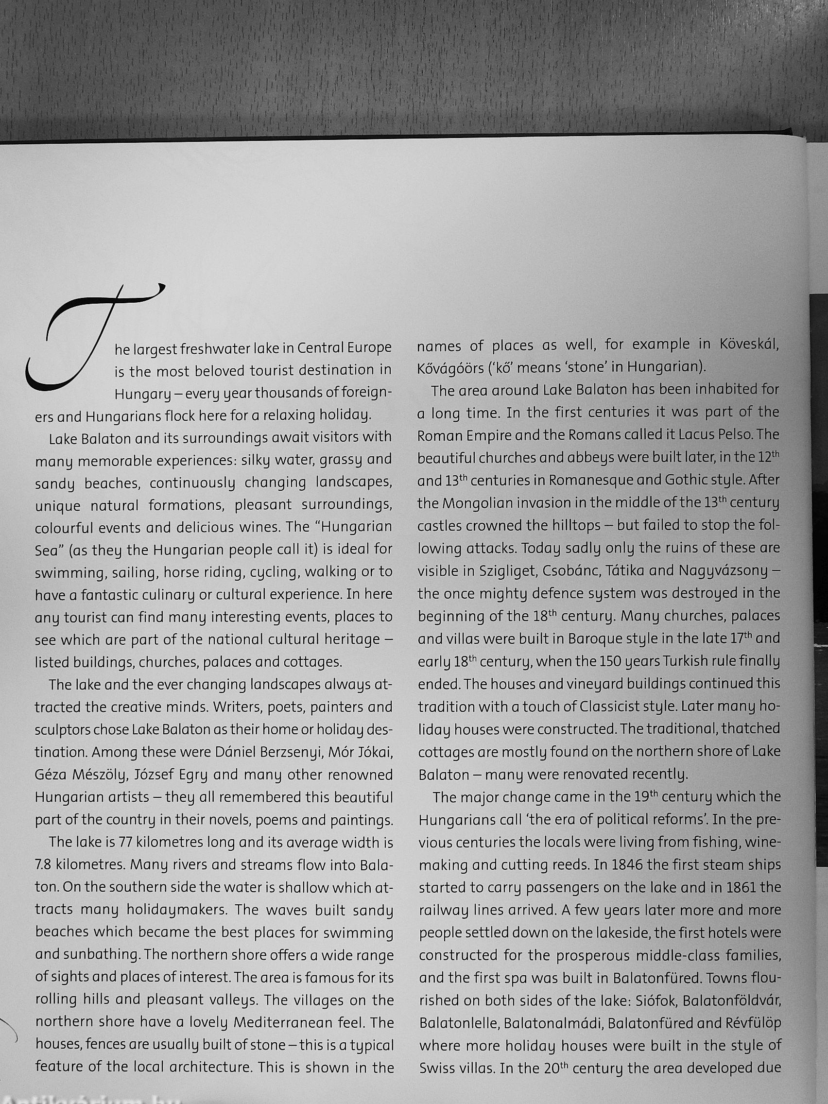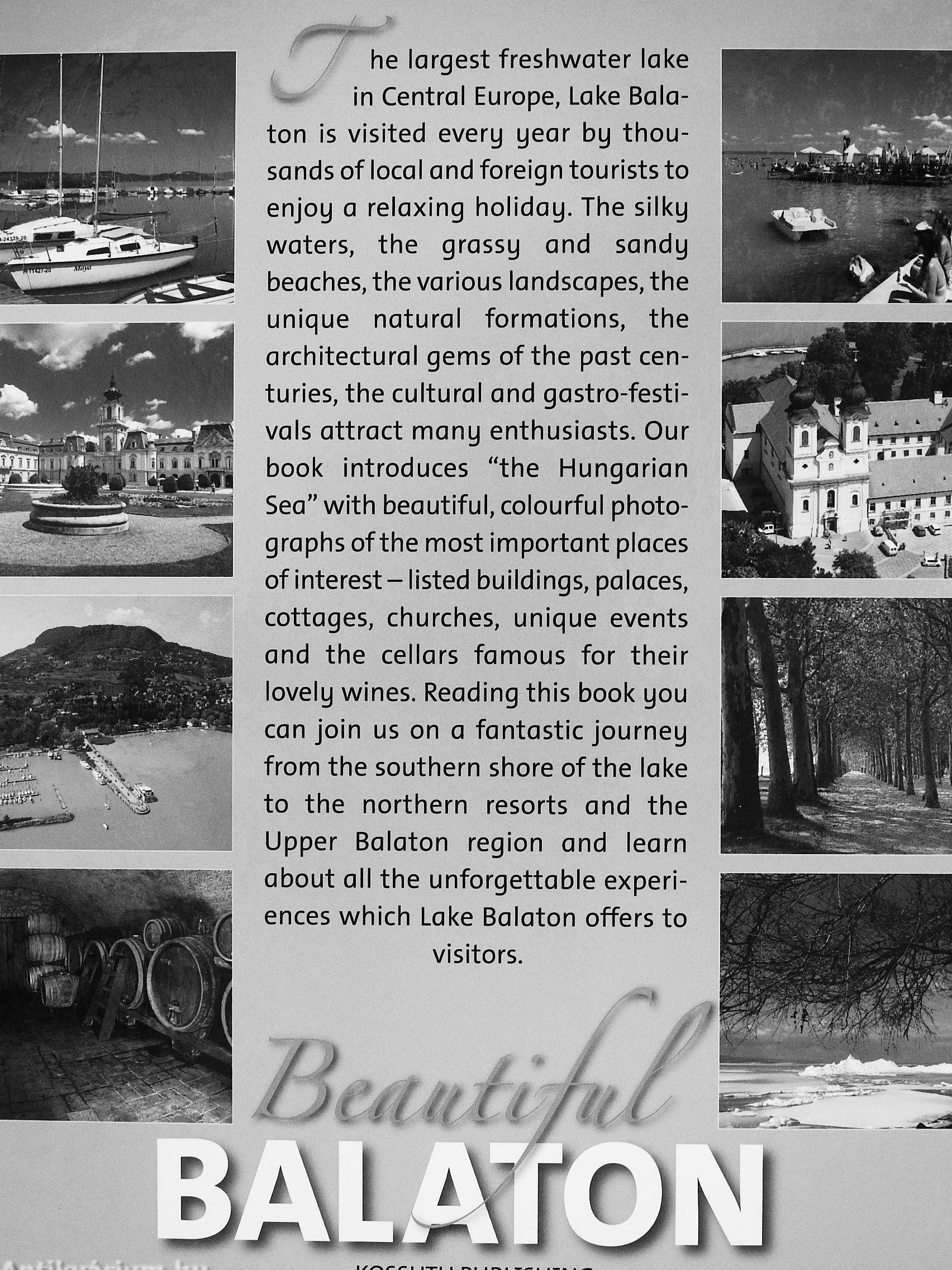 he largest freshwater lake ~ in Central Europe, Lake Balaton is visited every year by thousands of local and foreign tourists to enjoy a relaxing holiday. The silky waters, the grassy and sandy beaches, the various landscapes, the unique natural formations, the architectural gems of the past centuries, the cultural and gastro-festivals attract many enthusiasts. Our book Introduces "the Hungarian Sea" with beautiful, colourful photographs of the most important places of interest-listed buildings, palaces, cottages, churches, unique events and the cellars famous for their lovely wines. Reading this book you can join us on a fantastic journey from the southern shore of the lake to the northern resorts and the Upper Balaton region and learn about all the unforgettable experiences which Lake Balaton offers to visitors.