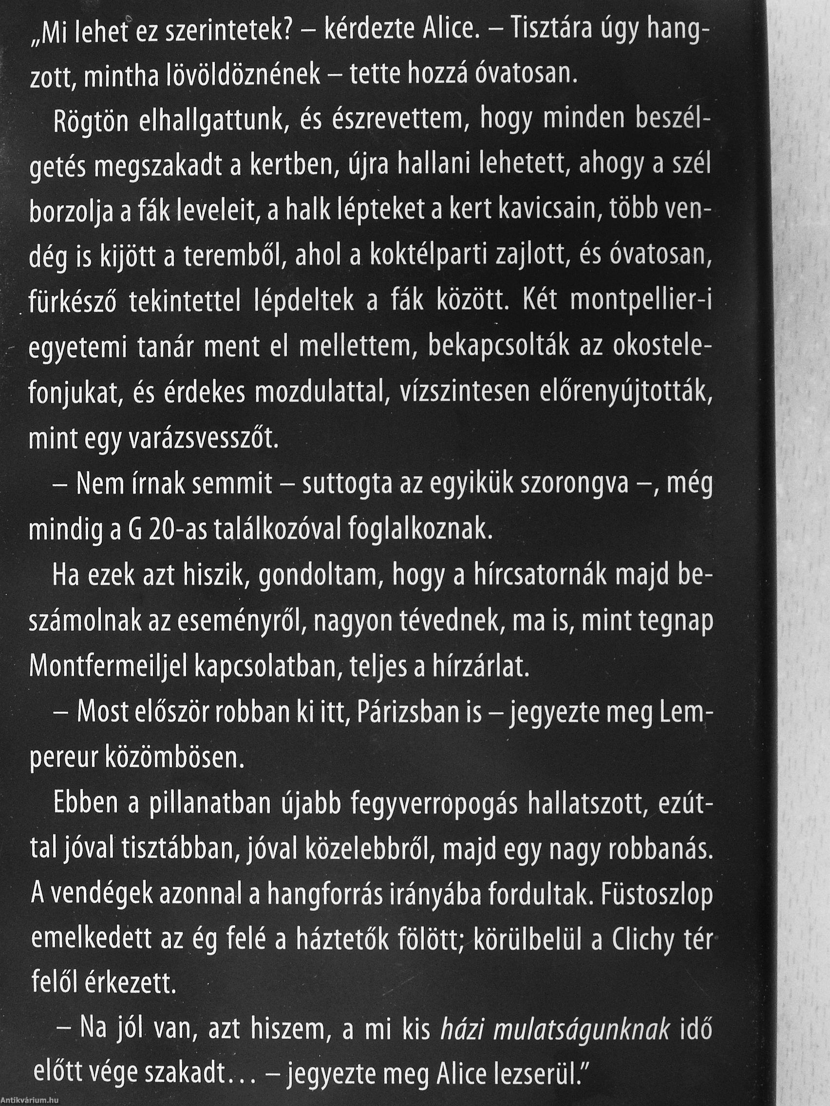Rögtön elhallgattunk, és észrevettem, hogy minden beszélgetés megszakadt a kertben, újra hallani lehetett, ahogy a szél borzolja a fák leveleit, a halk lépteket a kert kavicsain, több vendég is kijött a terembó'l, ahol a koktélparti zajlott, és óvatosan, fürkésző tekintettel lépdeltek a fák között. Két montpellier-i egyetemi tanár ment el mellettem, bekapcsolták az okostelefonjukat, és érdekes mozdulattal, vízszintesen előrenyújtották, mint egy varázsvesszőt.