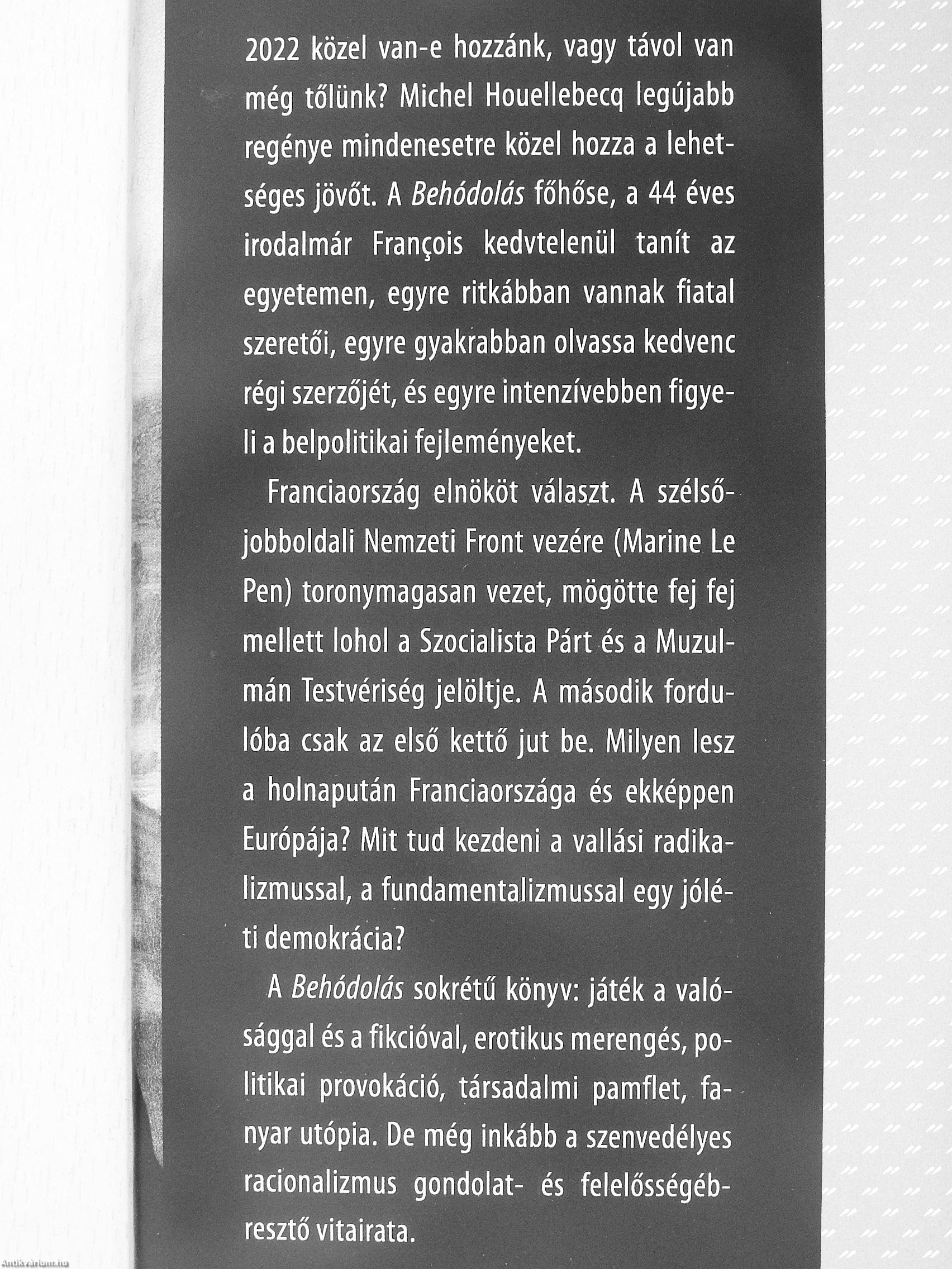 2022 közel van-e hozzánk, vagy távol van még tőlünk? Michel Houellebecq legújabb regénye mindenesetre közel hozza a lehetséges jövőt. A Behódolás főhőse, a 44 éves irodalmár François kedvtelenül tanít az egyetemen, egyre ritkábban vannak fiatal szeretői, egyre gyakrabban olvassa kedvenc régi szerzőjét, és egyre intenzívebben figyeli a belpolitikai fejleményeket.