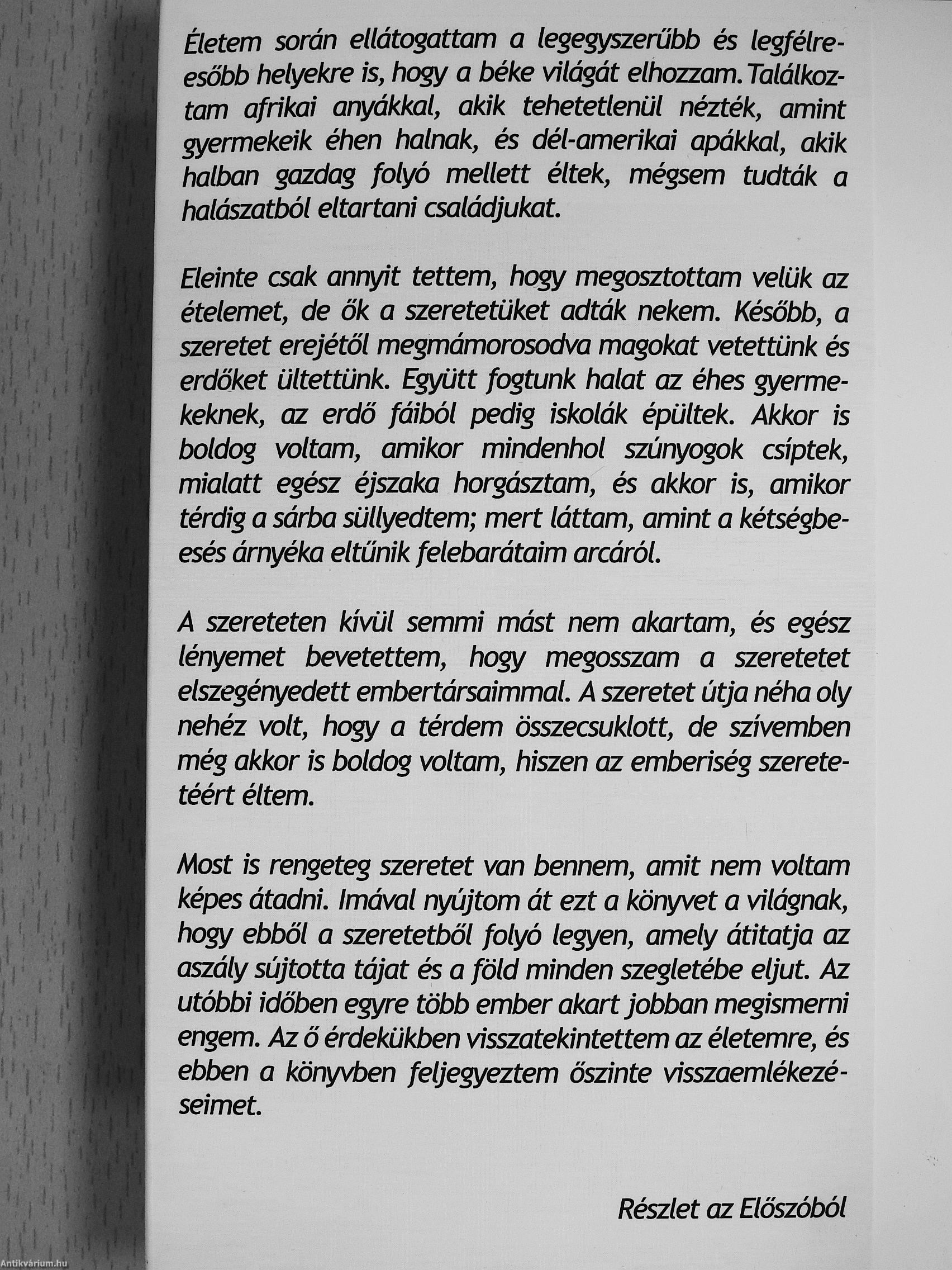 Életem során ellátogattam a legeg^erübb és lesfélre-esőbb helyekre is, hogy a béke világát elhozzam. Találkoztam afrikai anyákkal, akik tehetetlenül nézték, amint gyermekeik éhen halnak, és dél-amerikai apákkal, akik halban gazdag folyó mellett éltek, mégsem tudták a halászatból eltartani családjukat