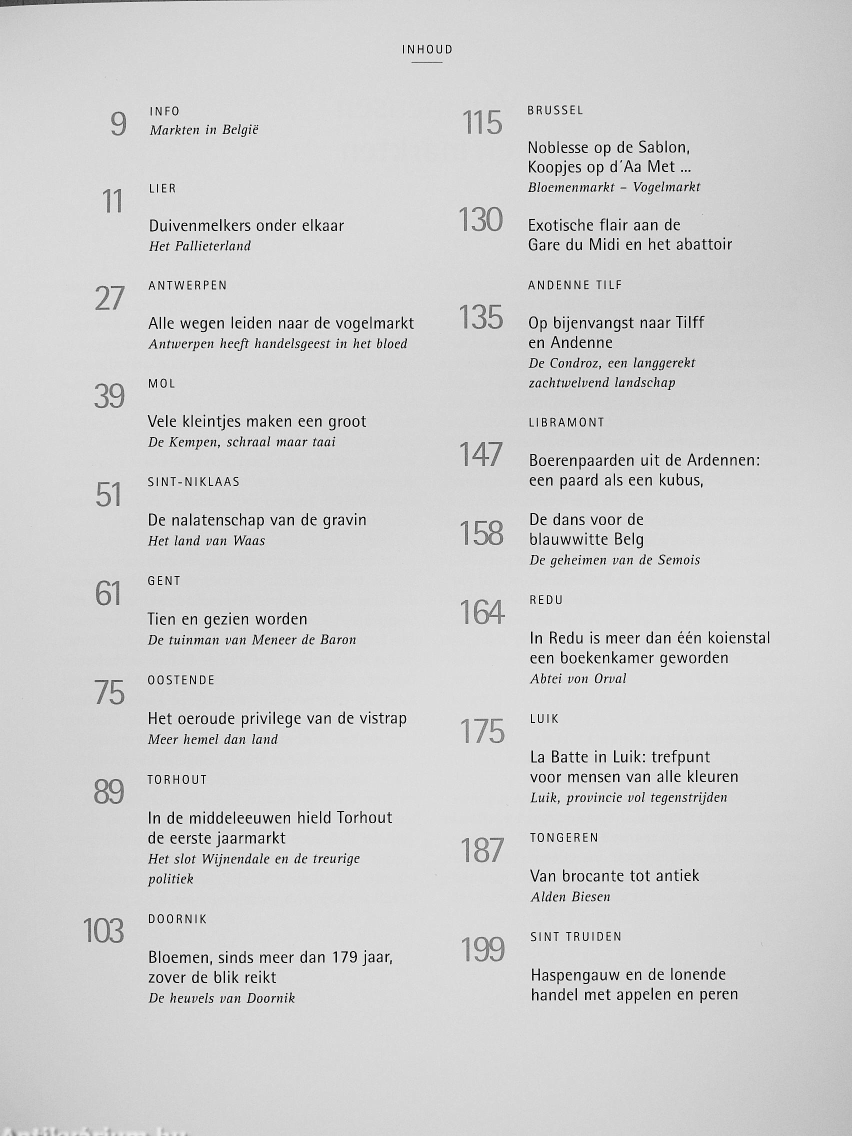 de typische geneugtes van het Belgisch leven. Ze volgden in de verschillende provincies het spoor van de meest merkwaardige markten. Tussen rommel en tafelzilver, konijnen en duiven, bloemen en bijen,